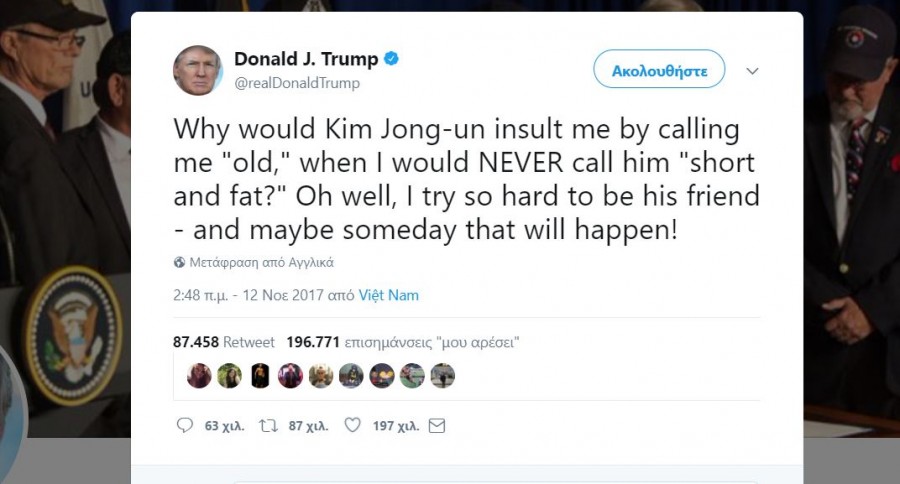 «Γιατί ο Κιμ Γιονγκ Ουν να με προσβάλει αποκαλώντας με ‘γέρο’, όταν εγώ δεν θα τον χαρακτήριζα ΠΟΤΕ ‘κοντό και χοντρό`; Ας είναι, προσπαθώ τόσο πολύ να γίνω φίλος του – και ίσως κάποια μέρα αυτό να συμβεί!», τόνισε στο tweet του ο Τραμπ.