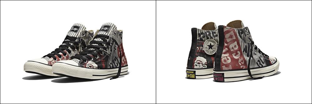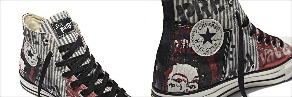 Chuck Taylor All Star Sex Pistols. To θρυλικό πανκ συγκρότημα και τα sneakers συναντιούνται, αφού οι Sex Pistols, εμφανίζονται ως το θέμα της τελευταίας συνεργασίας της Converse, που προβάλλει εμβληματικές εικόνες και γραφικά εμπνευσμένα από τον Johnny Rotten και τον Sid Vicious.Στη συλλογή πρωταγωνιστούν χρώματα, υλικά και τα γραφικά εμπνευσμένα από το στυλ και το εμβληματικά εξώφυλλα των άλμπουμ του γκρουπ, που σημάδεψε την μουσική σκηνή υπό την καθοδήγηση του Μalcolm McLaren. Εικόνες, όπως το λεωφορείο Τhe Boredom από το single Pretty Vacant το 1977, που αρχικά παρουσιάστηκε σε προωθητικές αφίσες της Virgin Records, και η μεταξοτυπία του πορτραίτου της Βασίλισσας -ίσως η εικόνα που αποτελεί συνώνυμο με το συγκρότημα- αποτυπώνονται σε μποτάκια από καμβά. Κάθε sneaker περιλαμβάνει το εμβληματικό λογότυπο των Sex Pistols στη γλώσσα του, καθώς και στον πάτο, ενώ λεπτομέρειες όπως βελονιές και επικαλύψεις με γραφικά προσδίδουν ένα ιδιαίτερο στυλ.