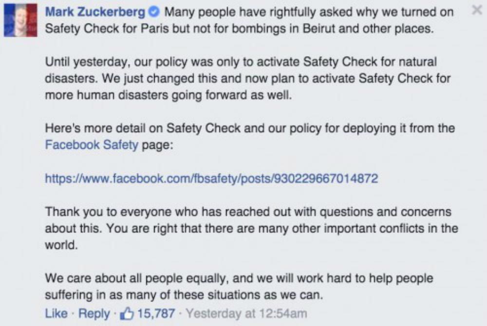 Ο Mark Zuckerberg από την άλλη, απάντησε στο κοινό του πως από εδώ και πέρα όλα αλλάζουν στο Safety Check. «Στο εξής θα ενεργοποιούμε το Safety Check σε περισσότερες περιπτώσεις ανθρώπινων καταστροφών», σημείωσε o Zuckerberg τονίζοντας ότι «το Facebook νοιάζεται το ίδιο για όλους τους ανθρώπους και θα φροντίσει να παράσχει εργαλεία βοήθειας σε όσους υποφέρουν, σε όσες το δυνατόν περισσότερες περιπτώσεις».