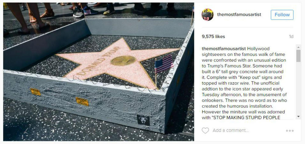 Από χθες το παρατηρεί πολύ πιο προσεκτικά. Και αυτό συμβαίνει γιατί ο Plastic Jesus πήγε τη νύχτα και έχτισε έναν φράκτη γύρω από το αστέρι του Τραμπ. Ο φράκτης είναι από τσιμέντο, έχει ύψος 20 πόντους και είναι διακοσμημένος με συρματόπλεγμα και ξυράφια καθώς και με προειδοποιητικές πινακίδες.