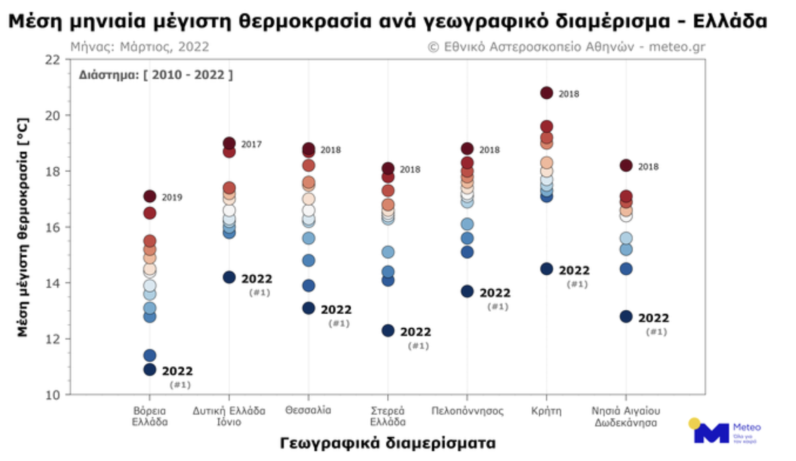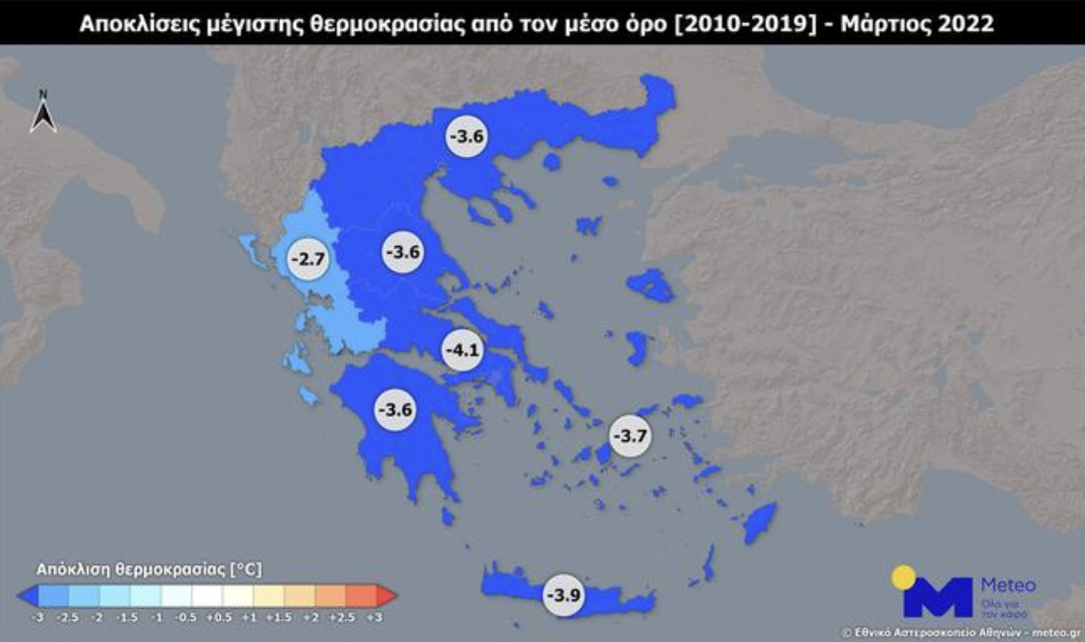 Σύμφωνα με τις καταγραφές των μετεωρολογικών σταθμών του Εθνικού Αστεροσκοπείου Αθηνών/meteo.gr, η μέση θερμοκρασία του Μαρτίου ήταν χαμηλότερη και από τους 3 μήνες του φετινού χειμώνα στη Θεσσαλία, τη Στερεά Ελλάδα, την Πελοπόννησο, την Κρήτη και τα Νησιά του Αιγαίου. Επιπρόσθετα, σύμφωνα με τις καταγραφές των ίδιων 53 μετεωρολογικών σταθμών, η μέση τιμή της μέγιστης ημερήσιας θερμοκρασίας ήταν η χαμηλότερη της περιόδου 2010-2021 σε όλη τη χώρα.