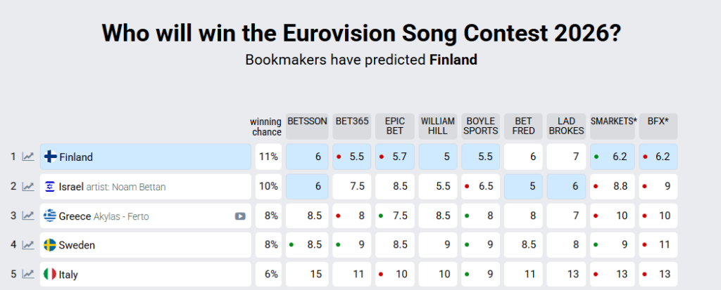 Όπως βλέπουμε, παραμένει σταθερά στην τρίτη θέση σχεδόν για όλες τις στοιχηματικές εταιρείες, με εξαίρεση σε εκείνες που βγαίνει δεύτερος. Στην πρώτη θέση βρίσκεται η Φιλανδία, με τους Lampenius και Parkkonen με το «Liekinheitin». Δεύτερο παραμένει το Ισραήλ, όχι λόγω τραγουδιού (μια και δεν έχει γίνει γνωστό ακόμη), αλλά λόγω του ότι ξέρουμε όλοι πως θα μπουν λυτά και δεμένα bots που θα βοηθήσουν το Ισραήλ να κατακτήσει την πρωτιά.