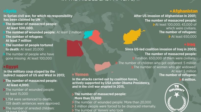 Με νέο προπαγανδιστικό φυλλάδιο που εξέδωσε η τουρκική κυβέρνηση που τιτλοφορείται «Οι απώλειες από τις Στρατιωτικές Παρεμβάσεις στην Μέση Ανατολή μετα την 9/11» επιρρίπτεται όλη η ευθύνη για την ανθρωπιστική τραγωδία της τελευταίας δεκαπενταετίας και την τραγωδία που βιώνει η Μέση Ανατολή, στις αμερικανικές παρεμβάσεις.
