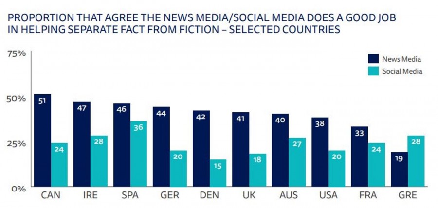 Υψηλή είναι η εκτίμηση που έχουν οι Έλληνες στα social media όσον αφορά στο διαχωρισμό της πραγματικής είδησης από την ψεύτικη. Το ποσοστό φθάνει στο 28% ενώ σε αντίθεση το ποσοστό καταποντίζεται στο 19% στην αντίστοιχη ερώτηση για τα news media