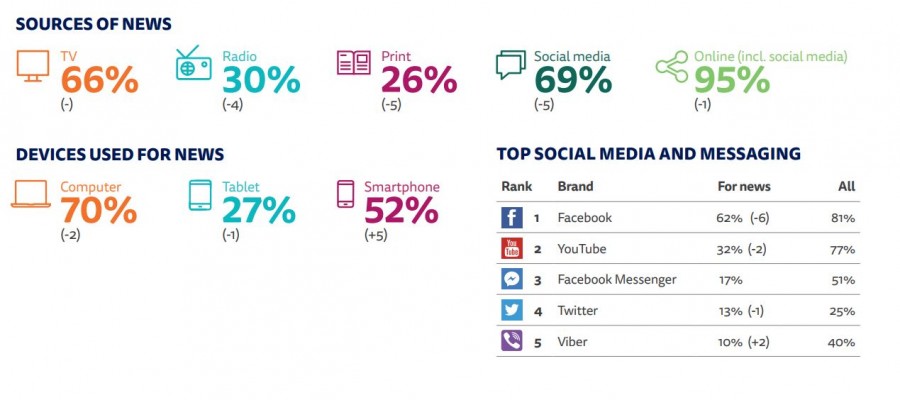 Το 95% των ερωτηθέντων απάντησαν ότι προτιμούν για την ενημέρωση τους τα digital μέσα (μαζί με τα social media). Μόνο από τα social media ενημερώνεται το 69% των Ελλήνων, ξεπερνώντας την τηλεόραση που φθάνει το 66%. Το ραδιόφωνο ακολουθεί με 30%, ξεπερνώντας τα έντυπα μέσα που βρίσκονται στο 26%. Όσον αφορά στα social media, το facebook βρίσκεται στην κορυφή όσων χρηστών τα επιλέγουν για ειδησεογραφική ενημέρωση με 62%, χάνοντας ωστόσο 6 μονάδες σε σχέση με την έρευνα του 2016. Τέλος τα smartphones ανεβαίνουν στις συσκευές που χρησιμοποιούνται για ενημέρωση κερδίζοντας 5 μονάδες σε σχέση με το 2016 και φθάνοντας το 52%. Σταθερά πρώτα σε αυτή την κατηγορία τα computers με 70% με πτωτική όμως τάση.