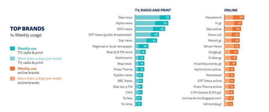 Ενώ το 95% των Ελλήνων αναζητά τις ειδήσεις online, η κατανάλωση είναι κατακερματισμένη και κανένα σήμα δεν χρησιμοποιείται τακτικά (περισσότερες από τρεις ημέρες την εβδομάδα) από περισσότερο από το 15% του online πληθυσμού. Οι Έλληνες χρησιμοποιούν επίσης περισσότερoυς εγχώριους ιστότοπους ειδήσεων κατά μέσο όρο σε σύγκριση με κάθε άλλη χώρα στην έρευνα εκτός από την Τουρκία.