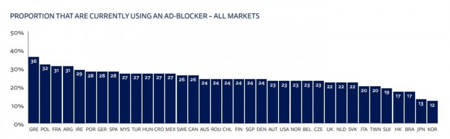 Η Ελλάδα είναι η πρώτη χώρα στον κόσμο σε χρήση ad-blockers. To ποσοστό των χρηστών που χρησιμοποιούν ad-blocker είναι 36%