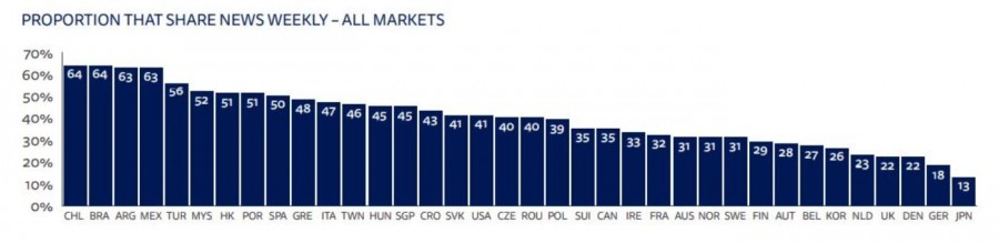 Οι Έλληνες είναι στις υψηλότερες θέσεις στον κόσμο όσον αφορά στο sharing ειδήσεων φθάνοντας το 48% (οι ΗΠΑ βρίσκονται στο 41%)