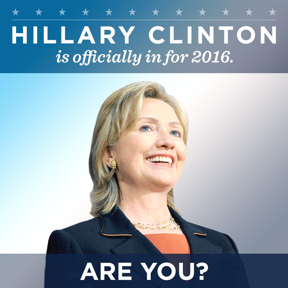 Κάπως έτσι και υπό μία τέτοια, ευνοϊκή περιρρέουσα ατμόσφαιρα προς το πρόσωπό της, η Χίλαρι έκανε το μεγάλο βήμα και ανακοίνωσε επίσημα στις 12 Απριλίου του τρέχοντος έτους, την υποψηφιότητά της για την Προεδρία των Ηνωμένων Πολιτειών μέσω ενός e-mail και ενός βίντεο στο οποίο δήλωσε πως: «Ο καθημερινός Αμερικανός χρειάζεται έναν υπερασπιστή. Και εγώ θέλω να είμαι αυτός ο υπερασπιστής».
