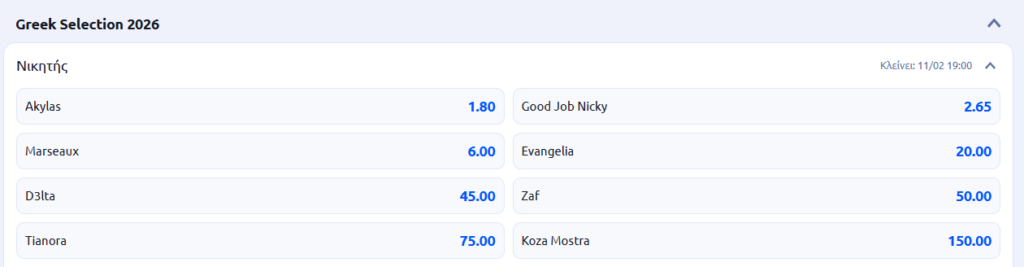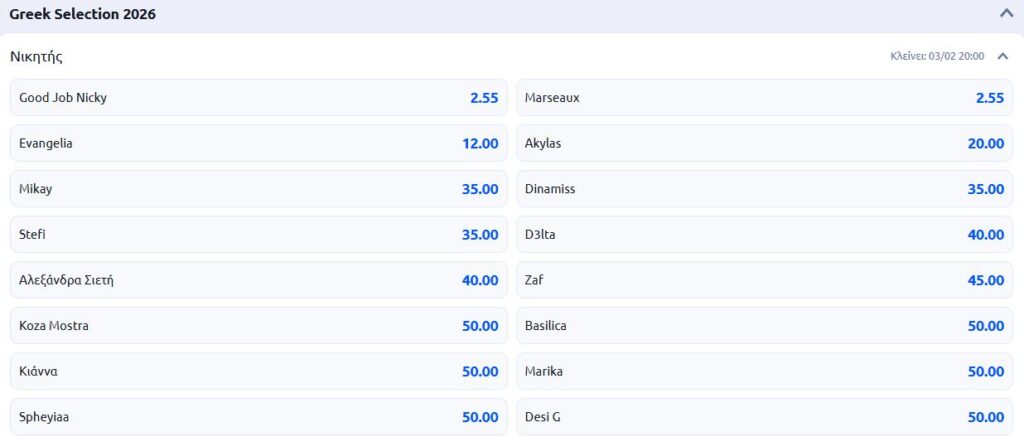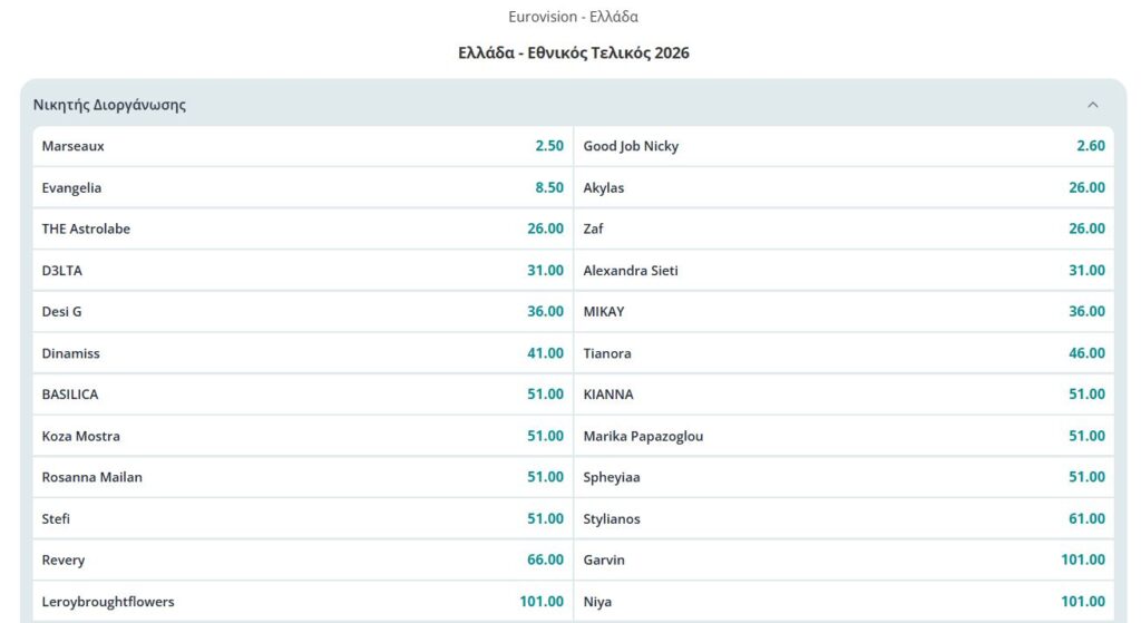 Ο Ιανουάριος του 2026 ήταν ένας μήνας ταραχώδης για τις στοιχηματικές εταιρείες και τις όποιες βεβαιότητες. Η ανάδειξη του νικητή του για τον εθνικό τελικό της Eurovision που θα πραγματοποιεί σε τρεις φάσεις (Α’ Ημιτελικός: Τετάρτη 11 Φεβρουαρίου, Β’ Ημιτελικός: Παρασκευή 13 Φεβρουαρίου, Τελικός: Κυριακή 15 Φεβρουαρίου) έχει ήδη αποδειχθεί μια μακρά διαδικασία, γεγονός που εντείνει την αγωνία, αλλά και επιτρέπει τις ανατροπές στα στοιχήματα. Τι πιο σύνηθες να συμβεί.