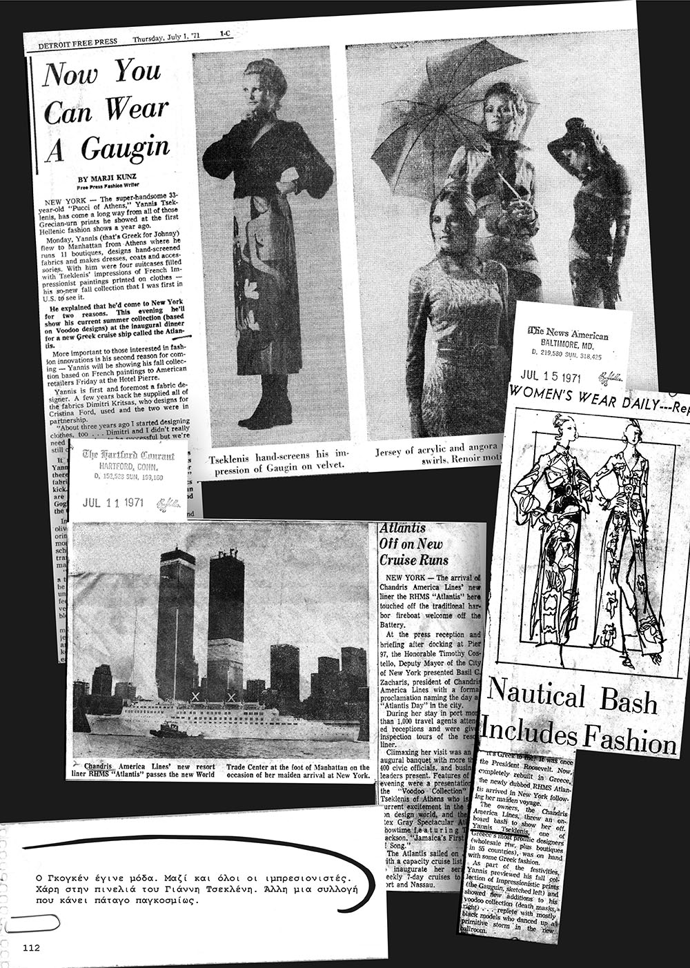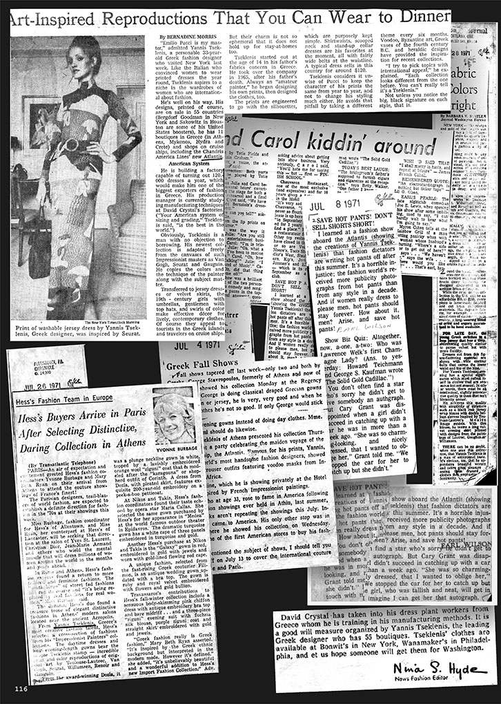 Συναντηθήκαμε με τον Γιάννη Τσεκλένη προχτές, μετά από πολλά πολλά χρόνια.Για έναν καφέ και μία συζήτηση. Με τον Γιάννη γνωριζόμαστε πολλά χρόνια. Όταν εγώ άρχισα να δουλεύω στην Γυναίκα το 1970, ο Γιάννη παρ` όλο που ήταν ακόμη πολύ νέος, ήταν ήδη πολύ γνωστός και στην Ελλάδα και στο εξωτερικό. O λόγος που ο Γιάννης Τσεκλένης είχε κάνει τόσο γρήγορα μεγάλο όνομα στο εξωτερικό ήταν γιατί οι ιδέες του, σύγχρονες αλλά και μαζί κλασικές, ήταν πολύ συμβατές με τον τρόπο που καταλάβαιναν την μόδα τότε, οι κύκλοι της Μόδας κυρίως της Νέας Υόρκης, αλλά το ίδιο συνέβαινε και με τις άλλες μεγάλες πρωτεύουσες της Μόδας. Λίγο καιρό μετά την γνωριμία μας τότε με τον Γιάννη, μου είχε εμπιστευτεί την φωτογράφιση για την κολεξιόν που είχε φτιάξει με θέματα επηρεασμένα από τους Γάλλους ιμπρεσιονιστές ζωγράφους, μια κολεξιόν που άφησε εποχή τότε, αλλά παραμένει επίκαιρη ακόμη και σήμερα. Στην φωτογράφιση είχαν ποζάρει η Έφη Μελά, η Αλεξάνδρα Παρνάσος η Dorthe Koenigsfeld και δυο ακόμη Αγγλίδες. Εγώ δεν έχω κρατήσει αρχεία από τις φωτογραφίσεις μου, αλλά εκεί που μιλούσαμε με τον Γιάννη και είχε ανοίξει και το τάμπλετ του για να δούμε τις τωρινές του δουλειές, που έχουν σχέση με την διαμόρφωση κτιρίων, κάτι που θα δούμε άλλη φορά, πέσαμε και πάνω στο αρχείο με αυτήν την φωτογράφιση. Ζήτησα από τον Γιάννη Τσεκλένη, να μας γράψει και δύο λόγια για εκείνη την φωτογράφιση. Και να το αποτέλεσμα από την φωτογράφιση της Κολεξιόν του Γιάννη Τσεκλένη, 43 χρόνια πριν.- Α.Τ.