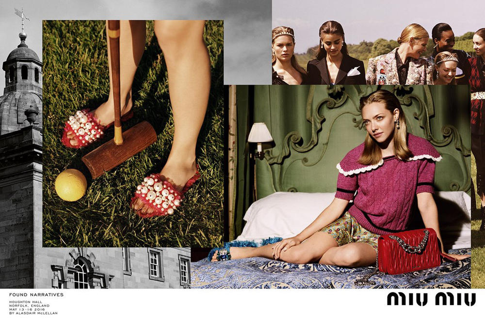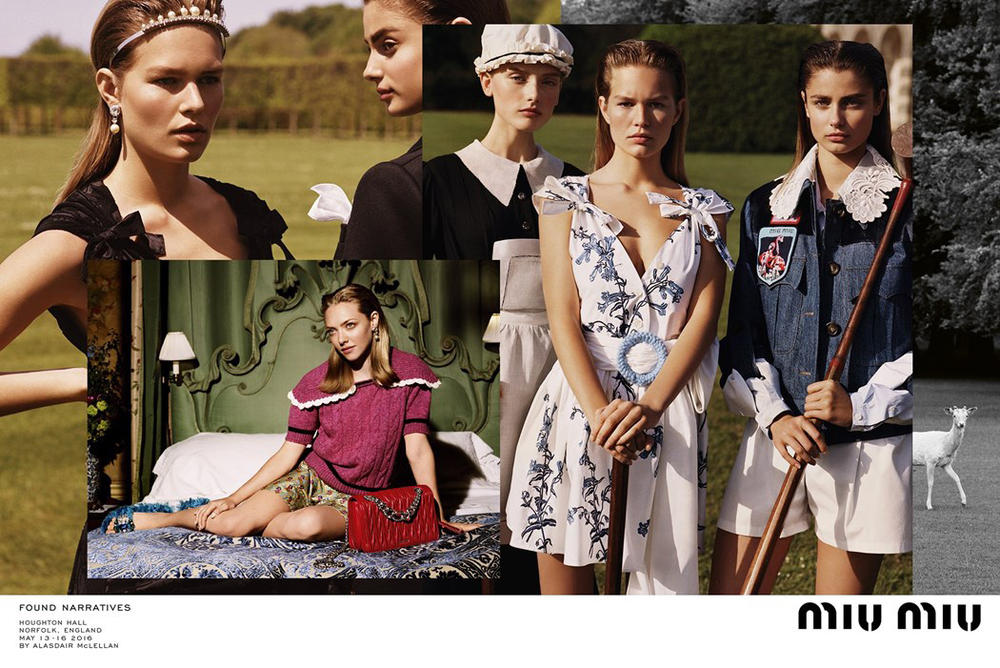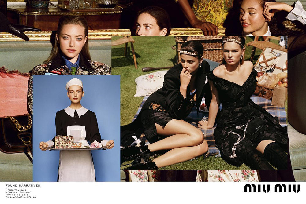Ο οίκος Miu Miu ταξιδεύει στην αγγλικη εξοχή και για την ακρίβεια στο ιστορικό Houghton Hall στο Norfolk για να φωτογραφίσει την ηθοποιό Amanda Seyfried που πρωταγωνιστεί στη νέα καμπάνια με τίτλο “High Society”. H καμπάνια φωτογραφήθηκε από τον φωτογράφο Alasdair McLellan με συμπρωταγωνίστριες τα μοντέλα Anna Ewers και Taylor Hill. Στοιχεία της καμπάνιας είναι οι πέρλες, το κροκέ και οι προσεγμένοι αγγλικοί κήποι καθως και οι κλασσικοί χαρακτήρες της αγγλικής αριστοκρατικής υπαίθρου όπως The Player, The Ingénue και The Whisperer. Εκτός από την Seyfried, η Μiu Miu έχει στο παρελθόν συμπεριλάβει στις καμπάνιες της την Elle Fanning, την Imogen Poots και τη Lupita Wyong’o.