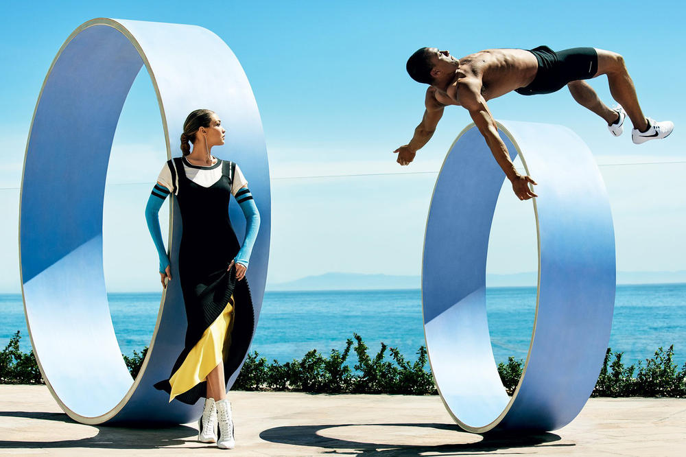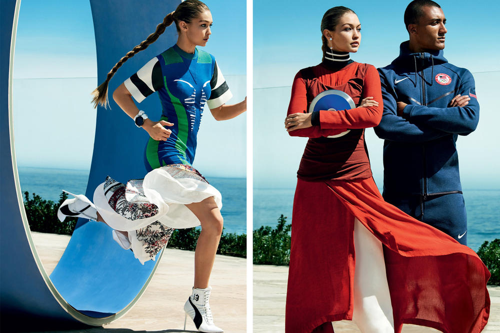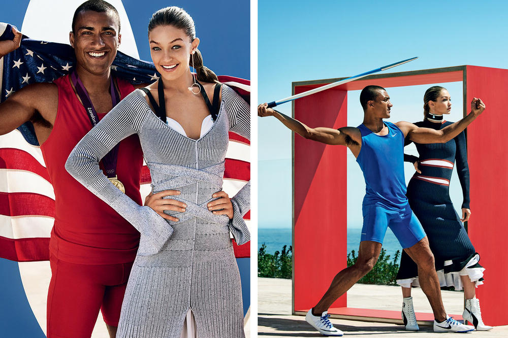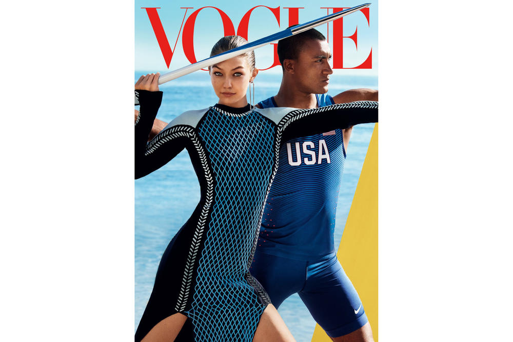 To επόμενο τεύχος της Vogue αναμένεται ιδιαίτερα καυτό, οπως άλλωστε αρμόζει στο μήνα Αύγουστο. Σε αυτό το τεύχος, το μοντέλο Gigi Hadid αποκτά επιτέλους το πρώτο της εξώφυλο στην Αμερικάνικη εκδοση του θρυλικού περιοδικού, το οποίο μοιράζεται με τον Αμερικανό δεκαθλητή και μέλος της Ολυμπιακής ομάδας, Ashton Eaton ο οποιος θα διεκδικήσει το χρυσό μετάλλιο στους Ολυμπιακούς του Rio. Η συμβολή του φαίνεται άλλωστε στην αθλητική πόζα της Hadid στο δισελιδο μέρος της φωτογράφισης. Άλλο ένα στοιχείο είναι η παρουσία του μοντέλου Fenty PUMA by Rihanna με τακούνια στιλέτο, σχεδιασμένο από τη Rihanna στο οποιο αναγράφεται το νούμετο 13 στα πλάγια.