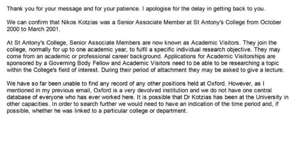 Ύστερα από αλλεπάλληλα, εκπαιδευτικά «χτυπήματα» στον Κοτζιά και το βιογραφικό του έρχεται ένα ακόμα. Σύμφωνα με το Πανεπιστήμιο της Οξφόρδης, ο νυν υπουργός Εξωτερικών έκανε ένα πέρασμα από το πανεπιστήμιο, αλλά δε δίδασκε. Τα αρχεία του Πανεπιστημίου της Οξφόρδης είναι αχανή και για αυτό η διοίκηση είναι επιφυλακτική. Ειδικότερα, επισημαίνει πως ο κ. Κοτζιάς μπορεί να βρισκόταν όντως στο πανεπιστήμιο, αλλά να τελούσε άλλα διοικητικά καθήκοντα.