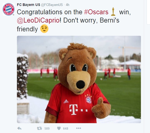 Έτσι οι Βαυαροί, μέσα απ΄τον αμερικάνικο λογαριασμό της ομάδας στο twitter, έδωσαν τα συγχαρητήριά τους στο μεγάλο νικητή, με ένα μήνυμα της μασκότ της ομάδας. Ο Berni, όπως λέγεται, είναι μια αρκούδα της οποίας τη φωτογραφία ανέβασε ο γερμανικός σύλλογος με το εξής σχόλιο : « Συγχαρητήρια για το 1ο σου Oscar Leonardo DiCaprio. Δεν θα πρέπει να ανησυχείς, ο Berni είναι φιλικός».