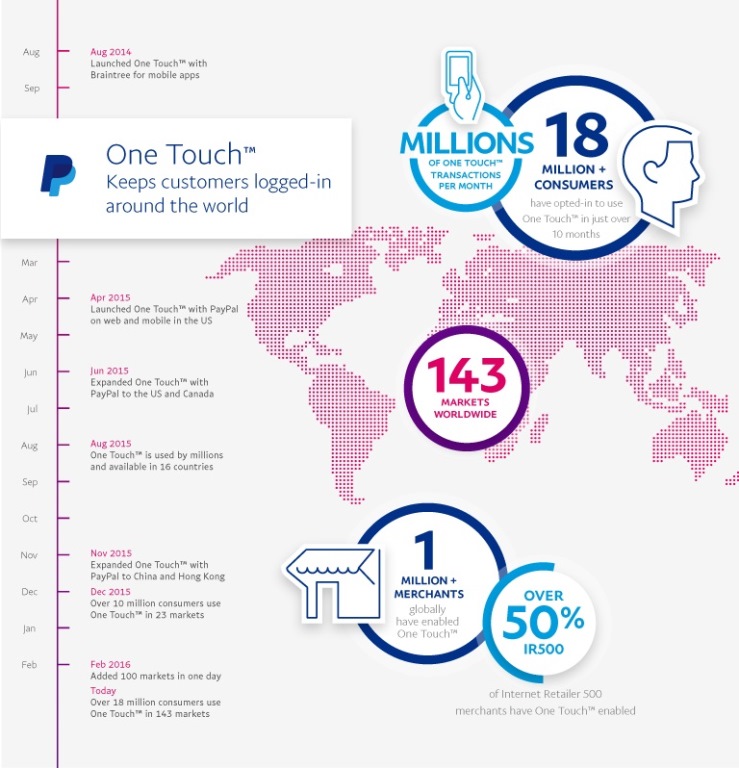 Από τις αρχές του έτους, η PayPal επέκτεινε το One Touch σε ολόκληρο τον κόσμο – προσθέτοντας άλλες 120 αγορές, καθιστώντας το σήμερα διαθέσιμο σε 143 αγορές (από 23 που ήταν στο τέλος του 2015). Με αυτόν τον τρόπο, νέες αγορές προστέθηκαν σε περιοχές της Κεντρικής και Ανατολικής Ευρώπη, της Ασίας και της Κεντρικής Αμερικής.