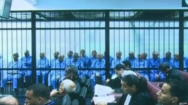 Μεταξύ των άλλων καταδικασθέντων είναι ο πρώην πρωθυπουργός Μπαγκνάντι αλ Μαχμούντι και ο διευθυντής της υπηρεσίας πληροφοριών Αμπντουλάχ αλ Σενούσι.