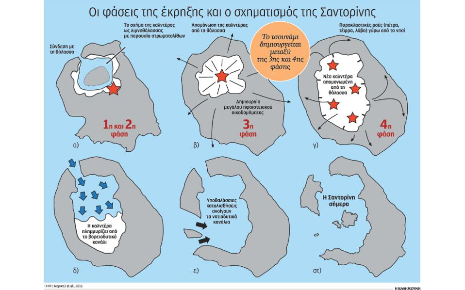 Στο γράφημα που δημοσιεύει η «Κ» φαίνονται πρώτη φορά τα τέσσερα στάδια της ηφαιστειακής δραστηριότητας που κράτησε αρκετούς μήνες και το πώς ήταν σχηματισμένη η καλντέρα της Σαντορίνης κατά τη διάρκειά της. Στην πρώτη φάση υπάρχει ένα μικρό κανάλι που συνδέει τη μικρή σε μέγεθος καλντέρα με τη θάλασσα και δημιουργεί ένα είδος λιμνοθάλασσας, όπως εξηγεί η κ. Νομικού. Οι υποθαλάσσιες κατολισθήσεις και τα προϊόντα της ηφαιστειακής δραστηριότητας «μπάζωσαν» το μικρό κανάλι και πάνω από το νησί απλώθηκε ένα τεράστιο νέφος τέφρας, όπως έγινε το 2010 με την έκρηξη του ηφαιστείου της Ισλανδίας.