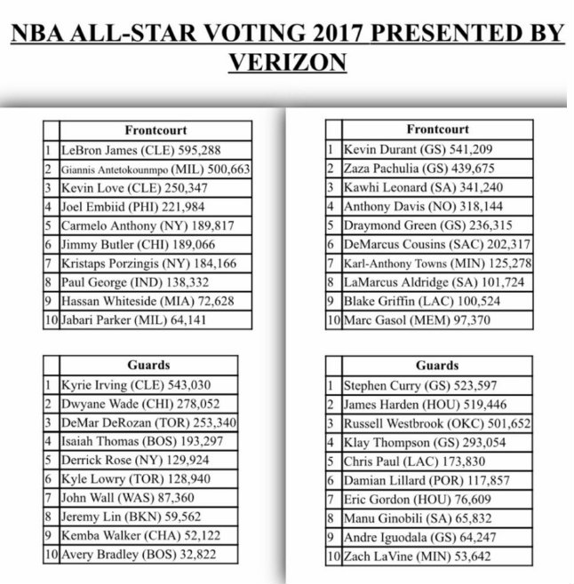 Τα παραπάνω στοιχεία οδηγούν στο συμπέρασμα, πως ο Αντετοκούνμπο δύσκολα δεν θα είναι βασικός με την ομάδα της Ανατολής στο All-Star Game, μαζί με τους Τζέιμς, Λοβ, Ίρβινγκ και Γουέιντ, ενώ στη Δυτική Περιφέρεια το πάνω χέρι έχουν οι Ντουράντ, Πατσούλια (πρέπει να έχει ψηφίσει όλη η Γεωργία), Λέοναρντ, Κάρι και Χάρντεν.