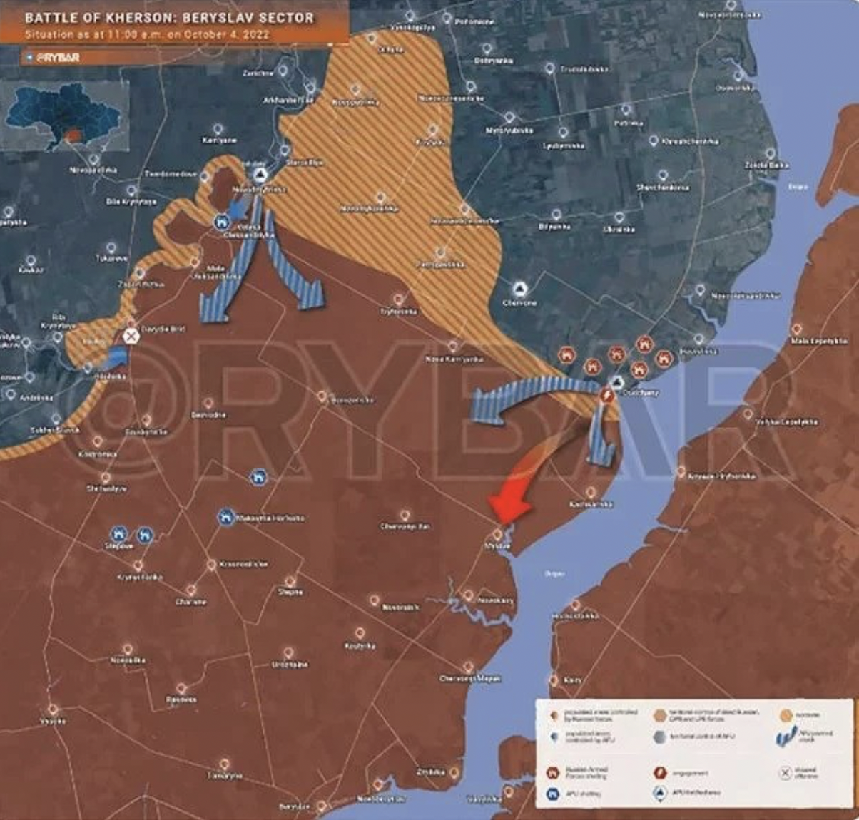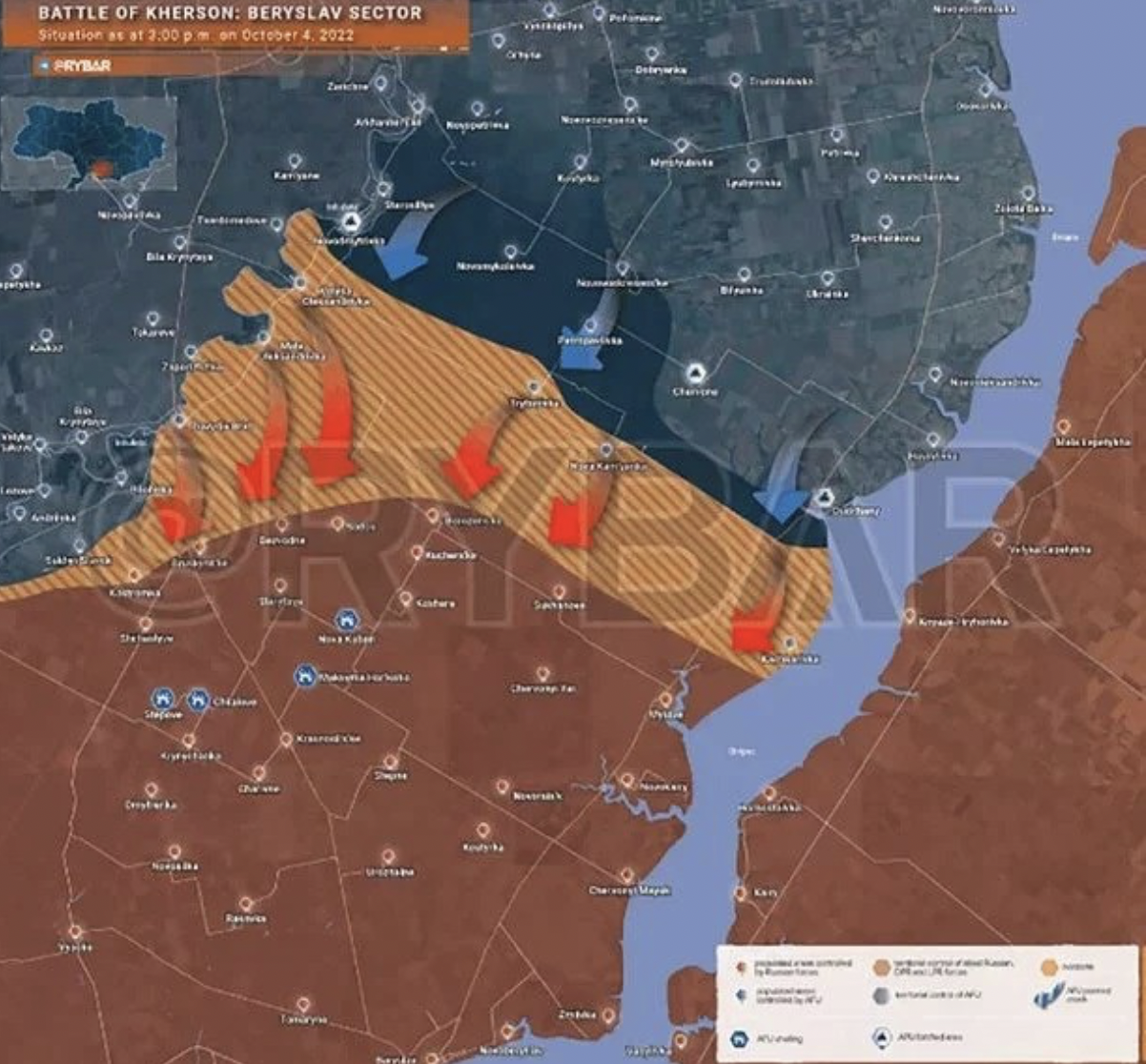 Είναι πραγματικά αδιανόητο αυτό που συμβαίνει στο συγκεκριμένο τομέα ( Νότια Ουκρανία ) μιας και το αφήγημα των τελευταίων εβδομάδων έλεγε ότι εκεί οι Ρώσοι είχαν ενισχύσει πολύ την άμυνά τους μεταφέροντας στρατεύματα και υλικό από τον Ανατολικό Τομέα, που δικαιολογούσε την επιτυχία των Ουκρανών εκεί. Το κυριότερο στοιχείο όμως είναι ότι η Χερσώνα αποτελεί κομβική πόλη στην προσπάθεια σύνδεσης της Ρωσίας με την Κριμαία και την κατάληψη και προσάρτηση των εδαφών της ανατολικής και νότιας Ουκρανίας που ανακοίνωσε μόλις πριν λίγες ημέρες ο Πούτιν.