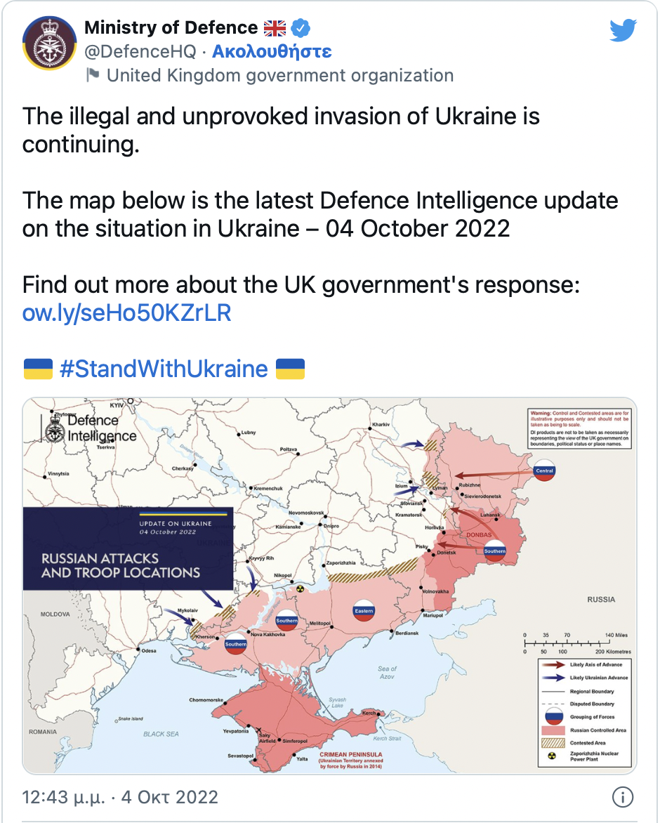 Αυτά που συμβαίνουν στην Ουκρανία τις τελευταίες μέρες δεν θα μπορούσε να φανταστεί ούτε ο πιο αισιόδοξος ουκρανός στρατιωτικός πριν λίγες εβδομάδες. Η μεγάλη εικόνα αν μπορεί κάποιος να την περιγράψει με λίγες λέξεις είναι η Απόλυτη Κατάρρευση της Ρωσικής Πολεμικής Μηχανής. Η εικόνα του μετώπου αλλάζει δραματικά μέσα σε λίγες ώρες κατά μερικά χιλιόμετρα υπέρ των Ουκρανών όπως δείχνουν χαρακτηριστικά χάρτες που δημοσιεύουν οι ίδιοι οι Ρώσοι. Μόνο χθες στο νέο μέτωπο που απασχολεί τους Ρώσους αυτό της Χερσώνας, οι Ουκρανικές δυνάμεις βάση των ρωσικών χαρτών προωθήθηκαν 30 περίπου χιλιόμετρα.