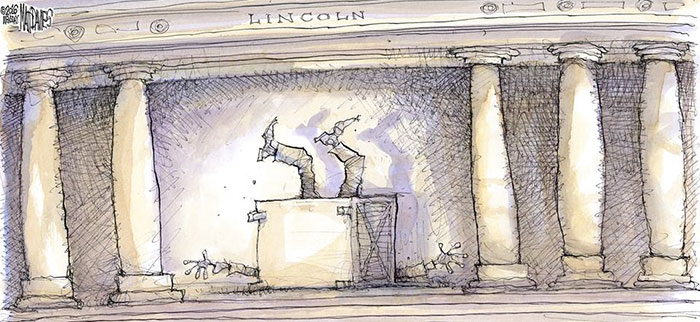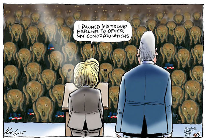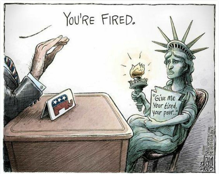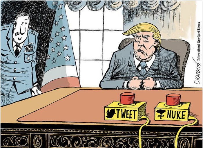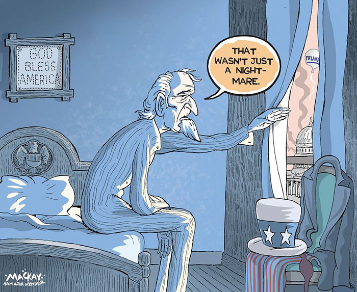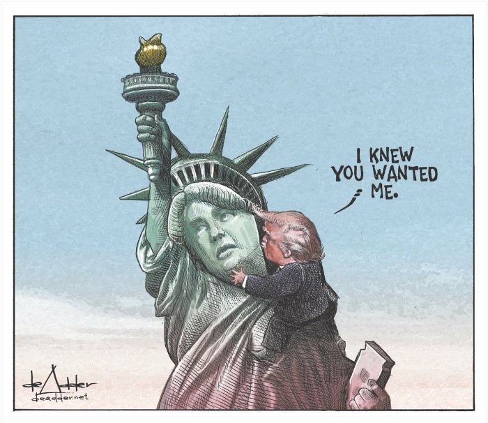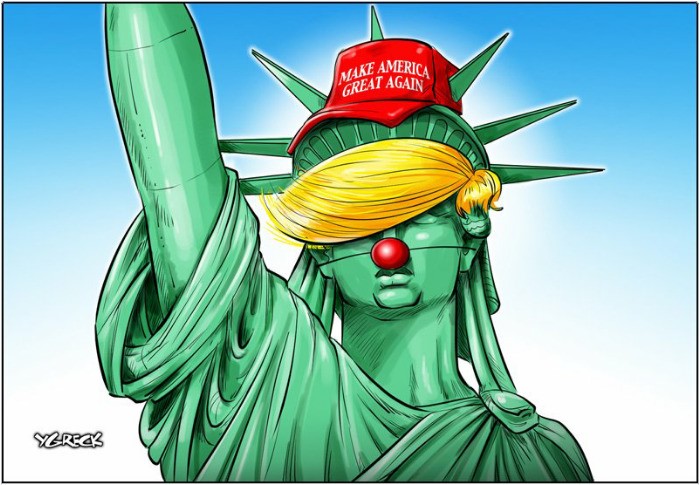 Οι γελοιογράφοι λοιπόν δεν μπορούσαν να μείνουν αμέτοχοι σε όλο αυτό και σήκωσαν τα μολύβια τους για να διαμαρτυρηθούν κατά του 45ου Προέδρου των ΗΠΑ και Πλανητάρχη πλέον-απίστευο κι όμως αληθινό- Donald Trump.
