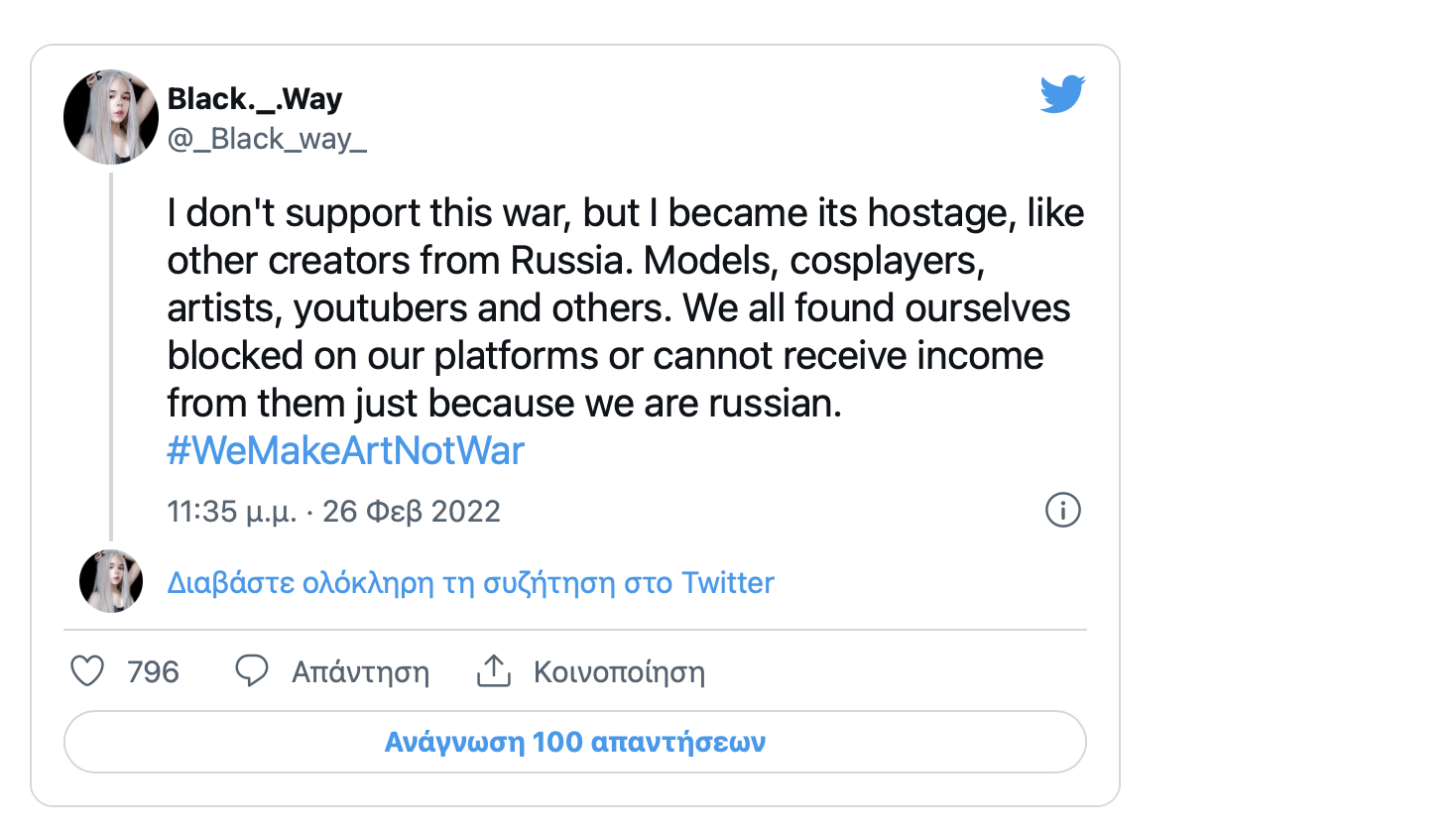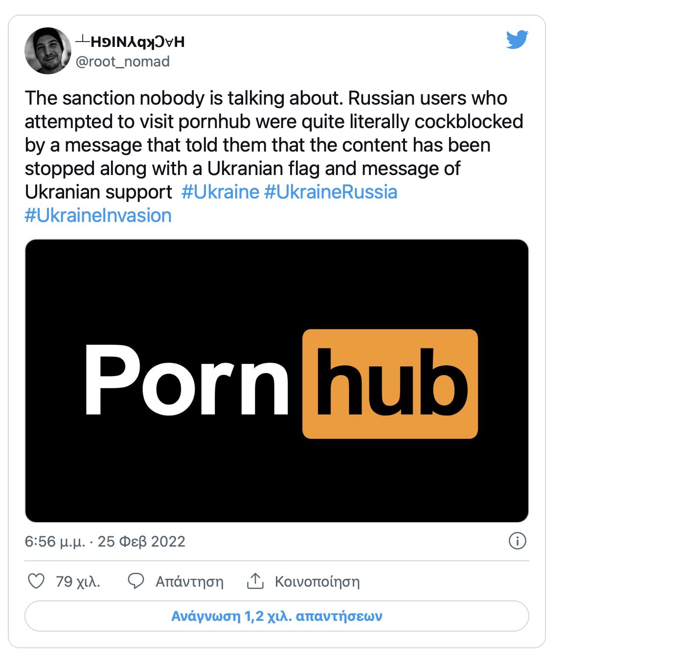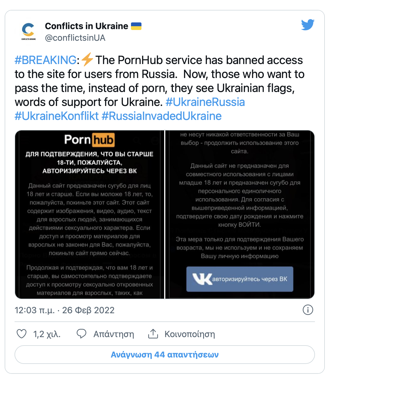 Μία εταιρεία και οι υπηρεσίες της μάλλον θα στοιχίσουν αρκετά στην προσωπική διασκέδαση και ευχαρίστηση των Ρώσων πολίτων αποφάσισε να σταματήσει να παρέχει τις υπηρεσίες της. Η πασίγνωστη υπηρεσία ερωτικού περιεχομένου Pornhub αποφάσισε να σταματήσει και να κλειδώσει τις υπηρεσίες της στην Ρωσία και αντί ερωτικού περιεχομένου εμφανίζει στις οθόνες την σημαία της Ουκρανίας. Επίσης εμφανίζεται και μια ανακοίνωση για την υποστήριξη του ουκρανικού λαού.