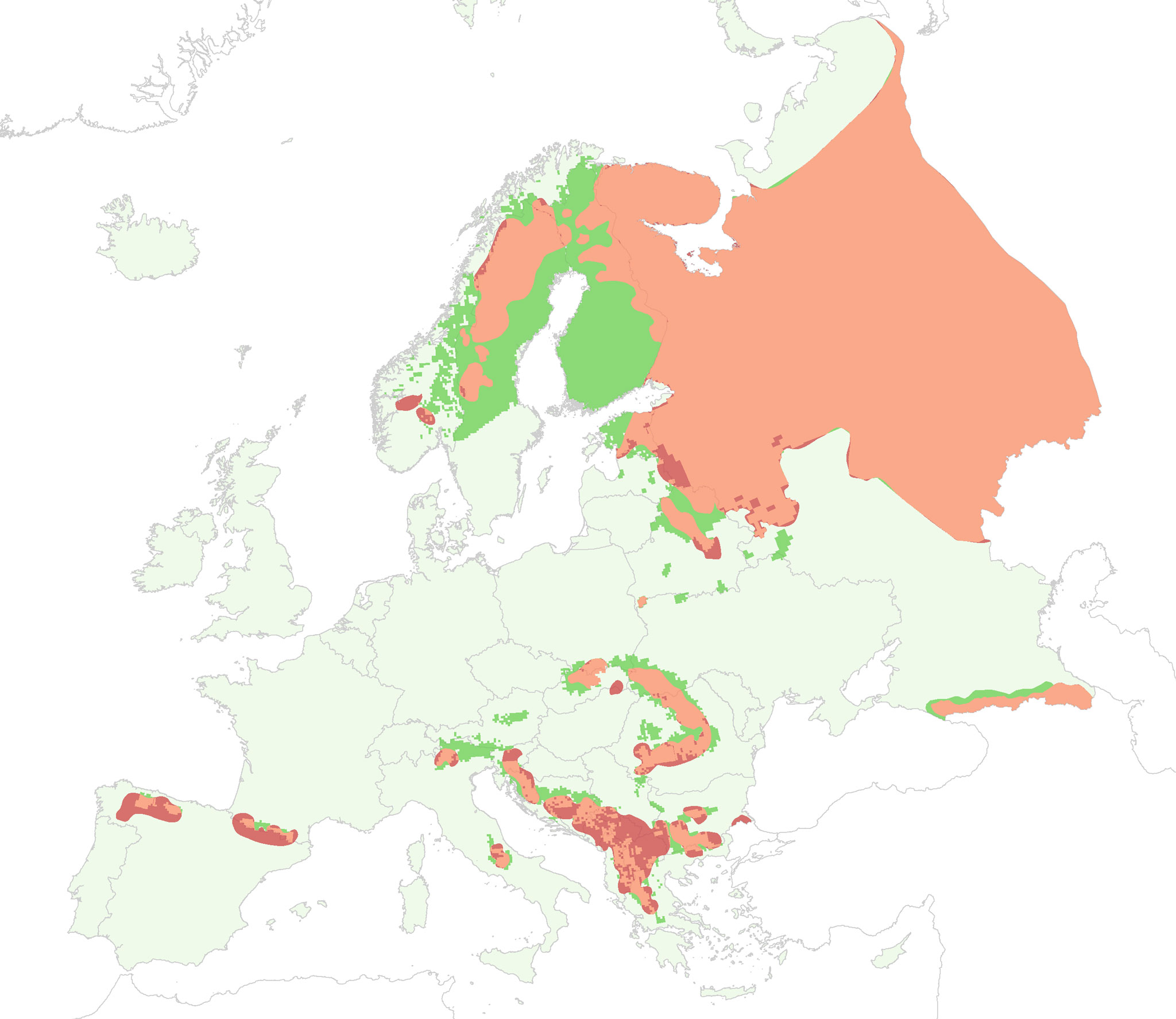 Στην Ελλάδα πλέον οι λύκοι έχουν φτάσει στο νοτιότερο σημείο εξάπλωσής τους λίγα μόλις χιλιόμετρα από την Αθήνα, στην Πάρνηθα, ενώ οι Αρκούδες επίσης κατεβαίνουν νοτιότερα και υπάρχει επιβεβαιωμένος πληθυσμός μέχρι και στο όρος Οίτη μετά την Λαμία.