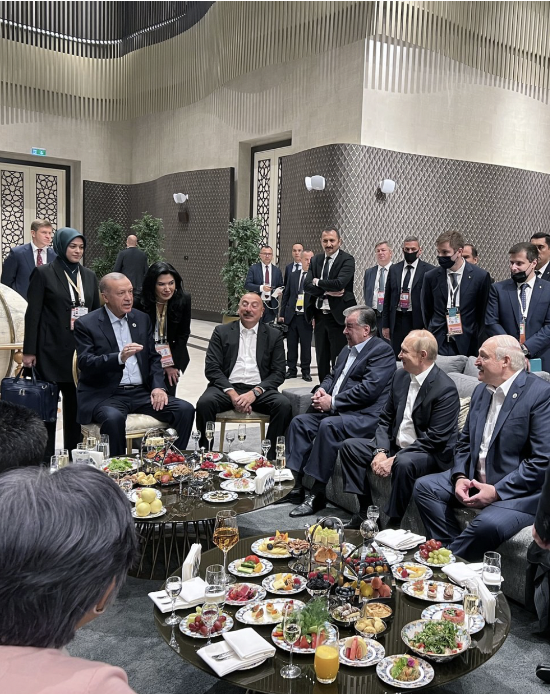 Η φράση μία φωτογραφία χίλες λέξεις δεν θα ταίριαζε περισσότερο από τη φωτογραφία όπου βλέπουμε όλο το αντίπαλο μπλοκ πλέον της Δύσης να ακούει τον μεγάλο ηγέτη Ερντογάν να λέει πώς δουλεύει όλη την αφελή Δύση τα τελευταία χρόνια προκαλώντας την ευθυμία στους πρησμένους από μπότοξ ηγέτες της Ρωσίας, Λευκορωσίας, Καζακστάν, Ιράν και Αζερμπαϊτζάν. Το εντυπωσιακό βεβαίως παρατηρώντας την φωτογραφία είναι η παρουσία του εύθυμου Πούτιν για πρώτη τους τελευταίους μήνες σε απόσταση αναπνοής από τον οποιοδήποτε άνθρωπο, κάτι που δεν μας έχει συνηθίσει στις συναντήσεις του με ξένους ηγέτες κρατώντας αποστάσεις ασφαλείας μερικών μέτρων. Μάλλον η όχι και τόσο καλή πορεία της εισβολής στην Ουκρανία και η διακαής ανάγκη για συμμάχους αλλά και υποστήριξη έμπρακτη από αυτούς τον αναγκάζει να κάθεται με όλους αυτούς τους τριτοκοσμικούς δικτάτορες της Ασίας μιας και τους έχει περισσότερη ανάγκη από ότι έχουν αυτοί τον Πούτιν.