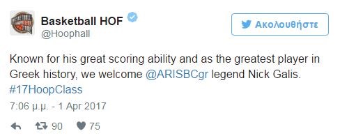 «Γνωστός για την σπουδαία ικανότητά του να σκοράρει και ως ο σπουδαιότερος καλαθοσφαιριστής στην ιστορία του ελληνικού μπάσκετ, καλωσορίζουμε τον θρύλο του Αρη, Νίκο Γκάλη», αναφέρει το σχετικό tweet του Ινστιτούτου, με όνομα του «γκάνγκστερ» να βρίσκεται πλάι σε αυτών των Τρέισι ΜακΓκρέιντι και του πρόσφατα εκλιπόντα, Τζέρι Κράουζε.