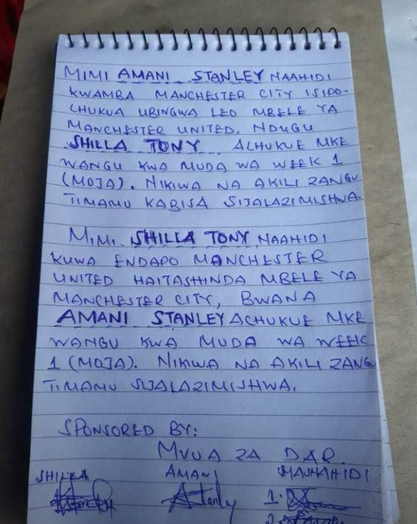 «Δια του παρόντος, εγώ ο Αμάνι Στάνλεϊ, υπόσχομαι να δώσω την σύζυγό μου για μια εβδομάδα στον φίλο μου, τον Τόνι Σίλα, αν η Μάντσεστερ Σίτι δεν κατακτήσει την Premier League στο ματς με την Μάντσεστερ Γιουνάιτεντ. Είμαι απολύτως καλά και δεν αναγκάστηκα από κανέναν σε αυτή τη συμφωνία», αναφέρει το συμφωνητικό σύμφωνα με την Nairobi News.