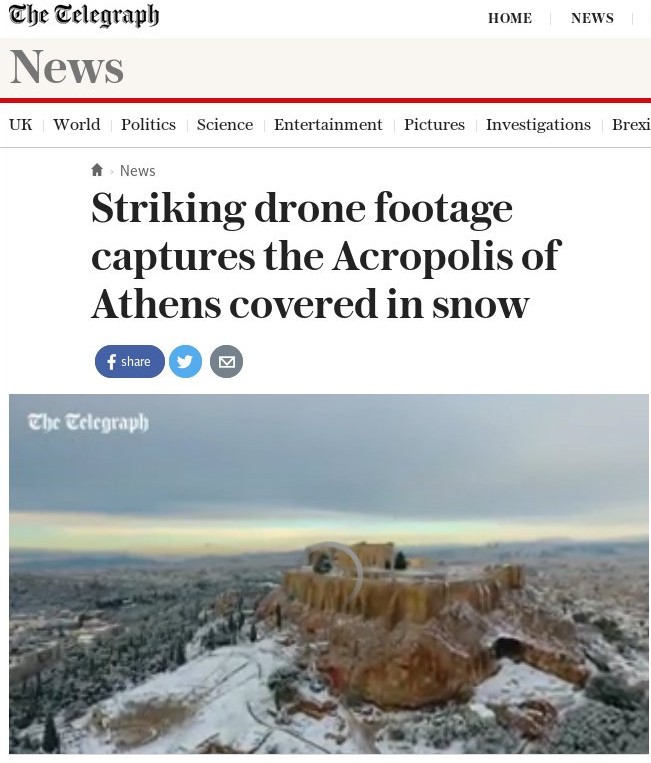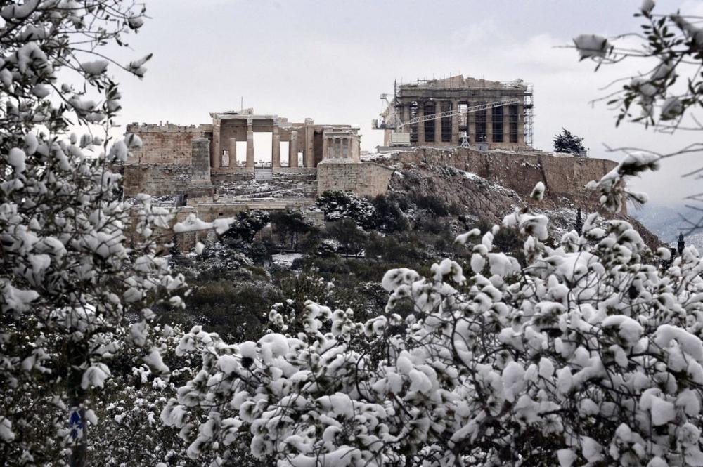 Το χιόνι «έντυσε» την Ακρόπολη στα λευκά αναδεικνύοντας το μεγαλείο της και ο ξένος τύπος δεν γίνεται να μείνει απαθής σε ένα ειδυλλιακό θέαμα.