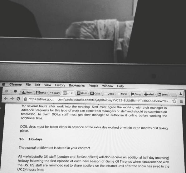 Ο λόγος για την εταιρεία λογισμικού +rehabstudio, η οποία με e-mail ενημέρωσε τους εργαζόμενους της πως θα δικαιούνται άδεια μισής ημέρας για κάθε επομένη επεισοδίου πρεμιέρας νέας σεζόν Game of Thrones για να μπορούν να το παρακολουθήσουν με την ησυχία τους και να μην κοιμούνται την επόμενη μέρα στη δουλειά.