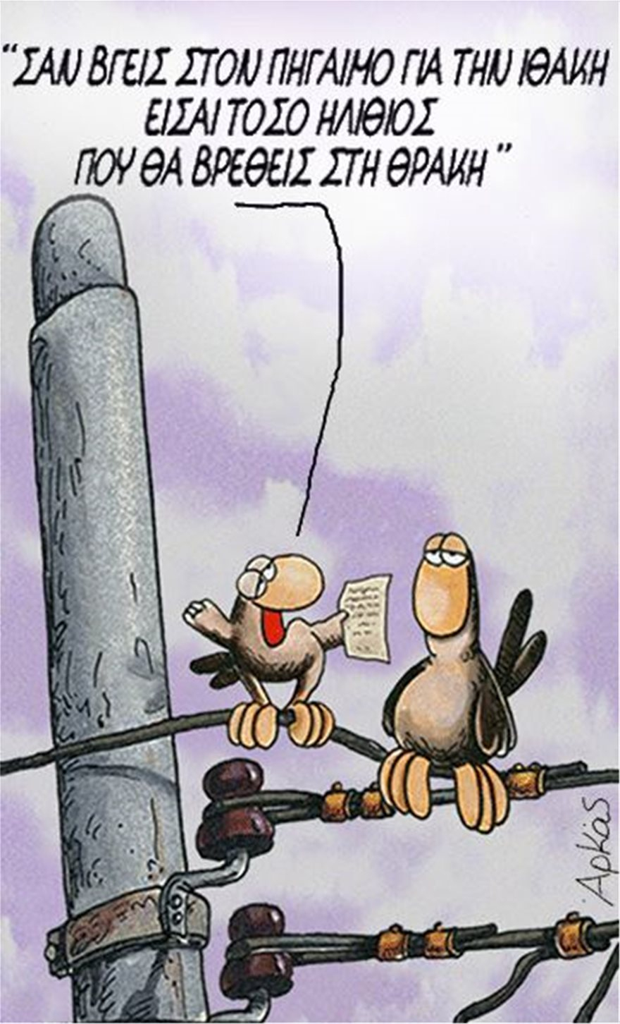 Ο γνωστός σκιτσογράφος χρησιμοποιεί τα αγαπημένα πουλιά, με τον γιο να λέει στον πατέρα: «Σαν βγεις στον πηγαιμό για την Ιθάκη, είσαι τόσο ηλίθιος που θα βρεθείς στη Θράκη».