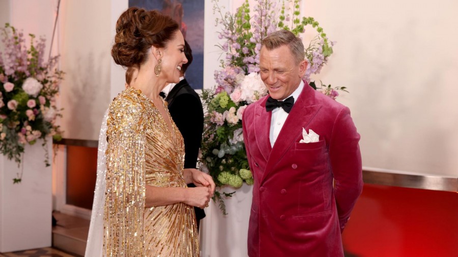Ενώ το κόκκινο χαλί ήταν γεμάτο από A-listers, συμπεριλαμβανομένων των αστέρων της ταινίας :Daniel Craig (επαναλαμβανόμενος ο ρόλος του ως Bond για τελευταία φορά), Rami Malek, Léa Seydoux and Lashana Lynch, η Δούκισσα του Cambridge είχε την τιμητική της με ένα εκθαμβωτικό χρυσό φόρεμα της Jenny Packham.