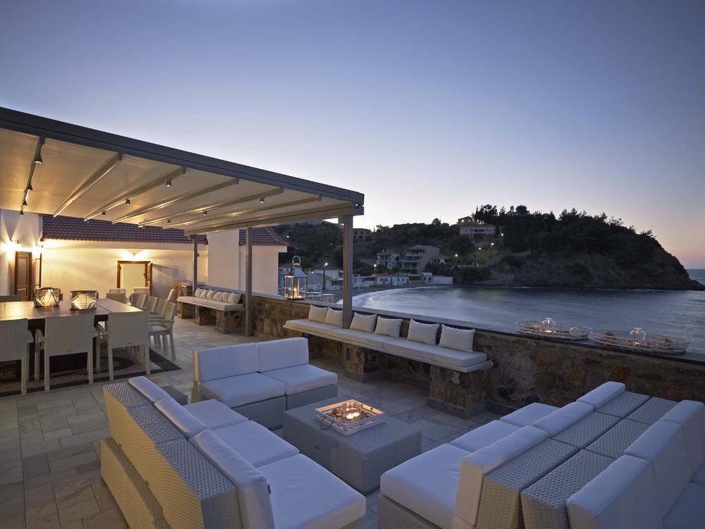 Οι εξωτερικοί χώροι σε απόλυτη επαφή με τη φύση διαθέτουν χώρους καθιστικού, και χαλάρωσης σε λευκές αποχρώσεις καθώς και μια τεράστια τραπεζαρία από ανθρακί γρανίτη.