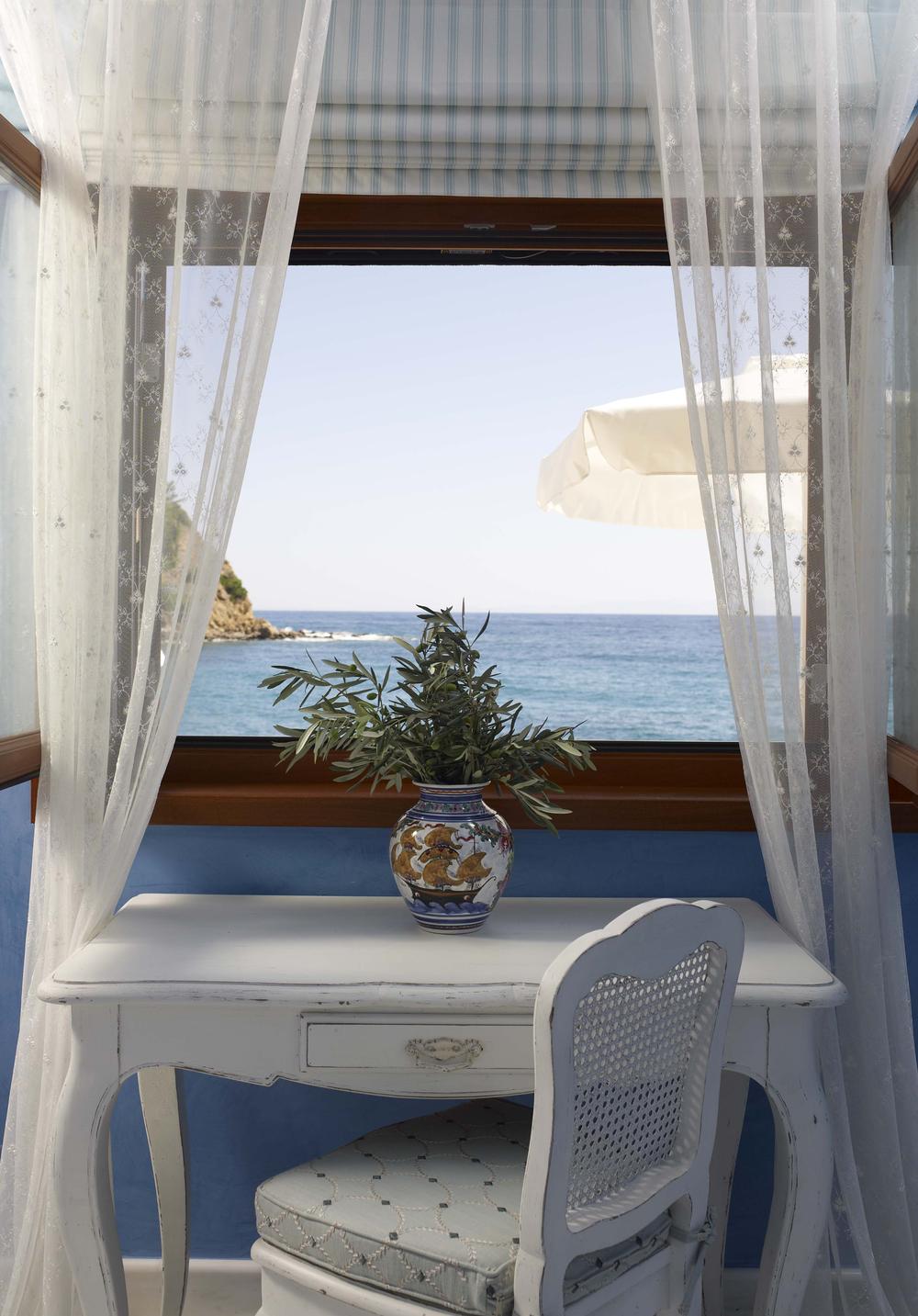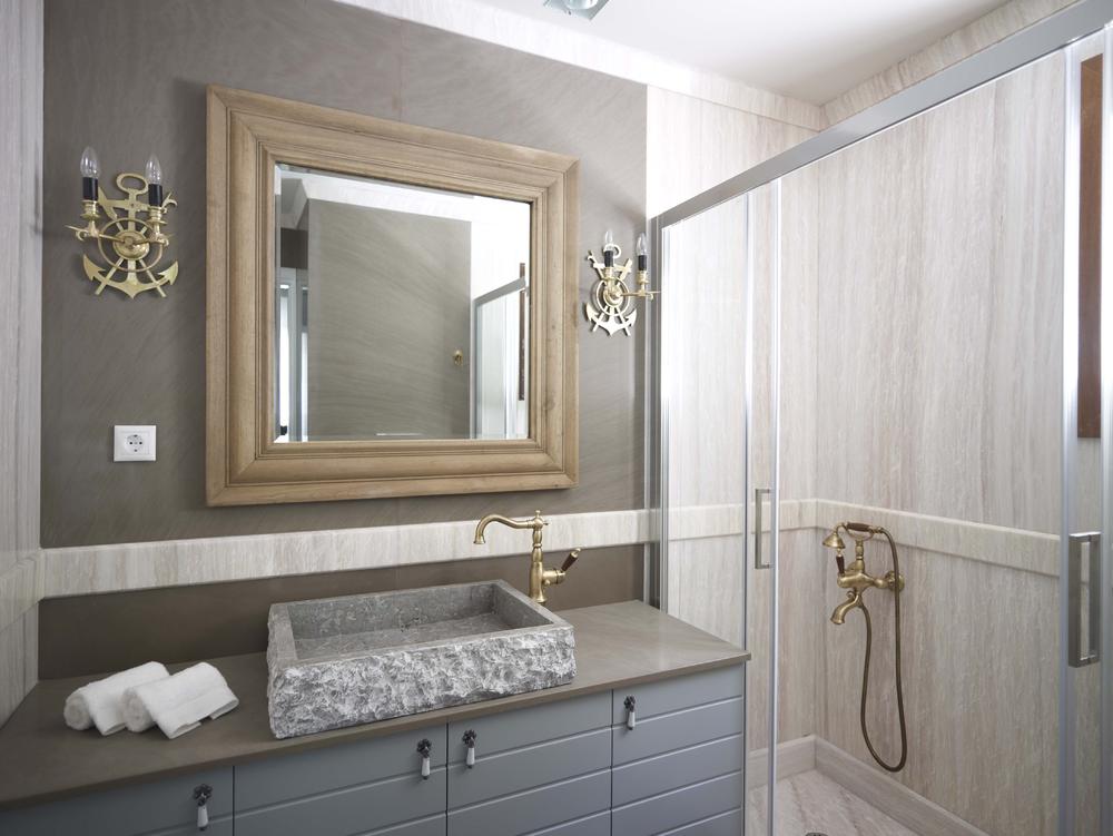 Τα μπάνια τους αντίστοιχα έχουν χρωματικούς συνδυασμούς με μάρμαρα Τήνου, Πεντέλης, Macauba και Portogalo. Κάθε ξενώνας έχει προσανατολισμό προς τη θάλασσα και ως εκ τούτου έχουν τοποθετηθεί τα γραφείου ως σημεία παρατήρησης της ανεπανάληπτης θέας.