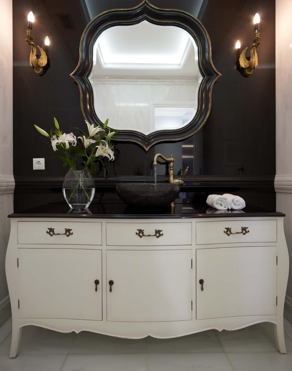 Στο κεντρικό wc δόθηκε μια έντονη αντίθεση λευκού μαύρου μαρμάρου με μπρούτζινες πινελιές.