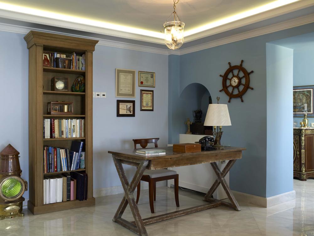 Ο βασικός άξονας για την μελέτη διακόσμησης υπήρξε η άμεση επαφή της κατοικίας με το απέραντο γαλάζιο του υδάτινου και ουράνιου ορίζοντα. Η συνομιλία με το μπλε της θάλασσας έχει εισχωρήσει και στους κοινόχρηστους χώρους του ισογείου, όπως το καθιστικό, ο χώρος του γραφείου και η κουζίνα. Μοναδικές αντίκες συλλογή της οικογένειας κοσμούν αυτούς τους χώρους και θυμίζουν την ναυτική προέλευση.