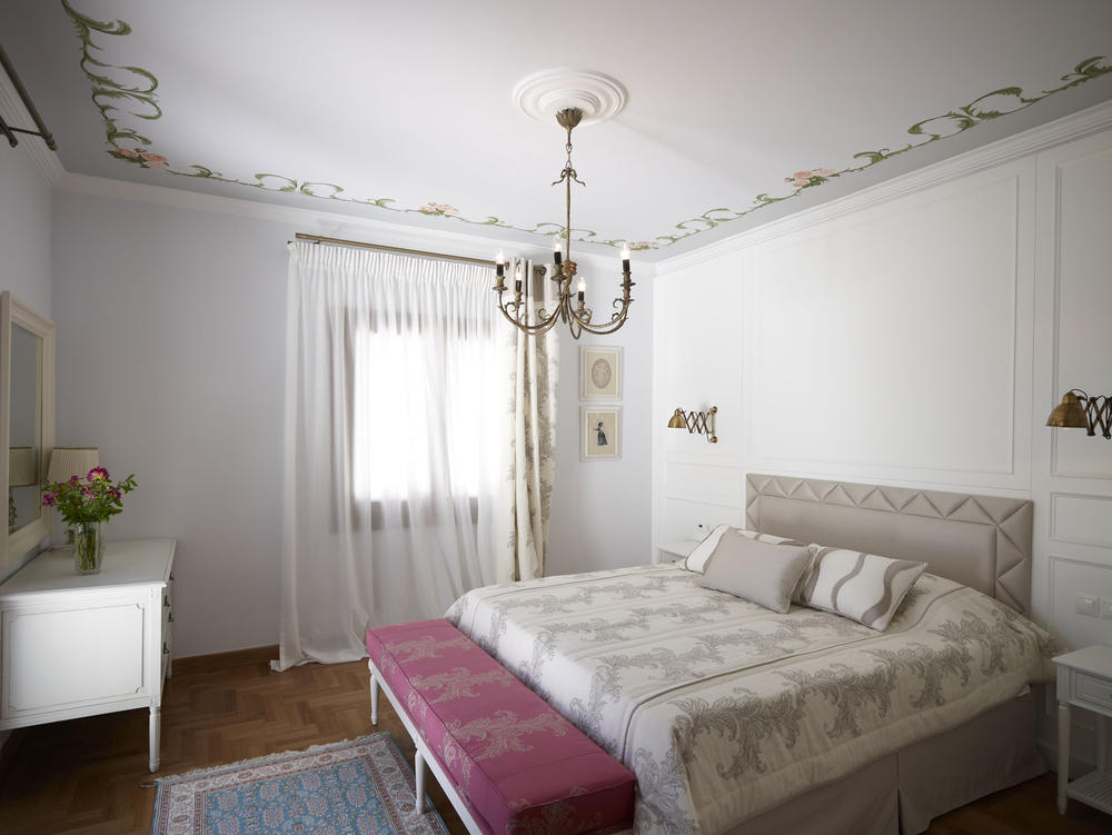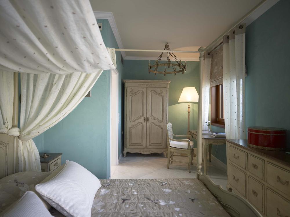 H κεντρική κρεβατοκάμαρα πλαισιώνεται από λευκούς ξύλινους ταμπλάδες και μια ρομαντική οροφογραφία. Αποδίδεται η αίσθηση της καθαρότητας του λευκού και αναδεικνύεται μέσα από τις χρωματικές πινελιές. Το λουτρό αυτού του δωματίου φέρει Θυμιανό Χιώτικο μάρμαρο σε συνδυασμό με Portogalo. Αντίστοιχα τα λουτρά στα παιδικά δωμάτια είναι ντυμένα με μάρμαρα Πεντέλης, Alpin, και Rosa Εgeo.