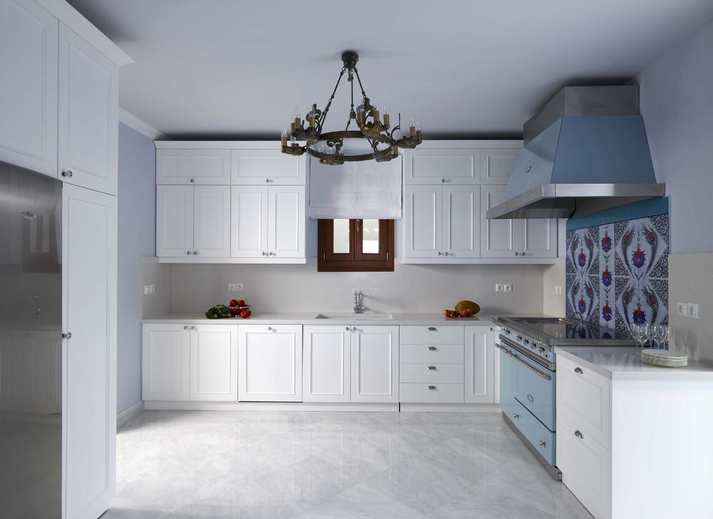 Η επένδυση της εστίας έχει γίνει από λευκό μάρμαρο με ένα πάντρεμα από χειροποίητα ζωγραφιστά πλακάκια εκ Τουρκίας. Άλλοι δυο ζωγραφικοί πίνακες βρίσκονται στο χώρο της κουζίνας ο ένας εκ των οποίων ντύνει τον τοίχο του γαλλικής προελεύσεως φούρνου μετατρέποντας τον σε κόσμημα.