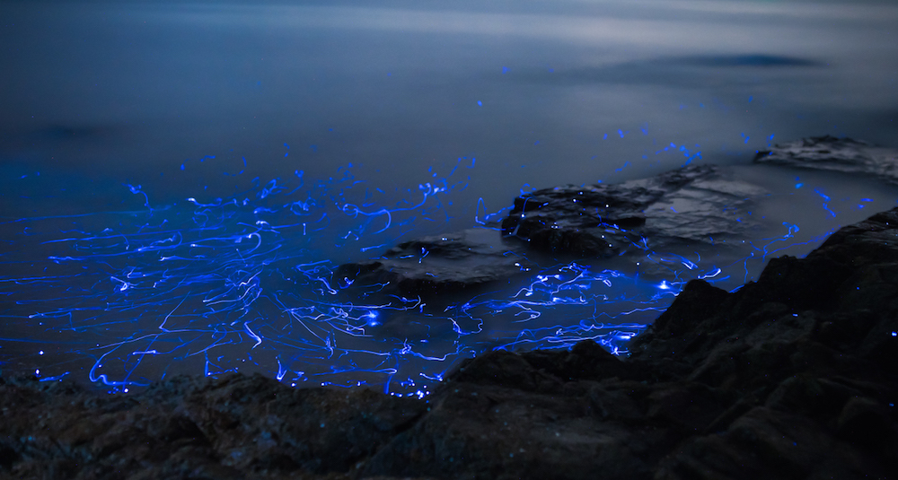 Το περίεργο αυτό οπτικό φαινόμενο παρατήρησαν και απαθανάτισαν στα ανοιχτά των ακτών της Οκαγιάμα στην Ιαπωνία το δίδυμο των φωτογράφων, Trevor Williams και Jonathan Galione. Οι διάσημοι φωτογράφοι κατάφεραν να απαθανατίσουν φωτογραφικά το απόκοσμο μπλε φως, που εκπέμπεται από ορισμένα θαλάσσια είδη, γνωστό και ως φαινόμενο βιοφωτισμού, έτσι όπως απλώθηκε πάνω στα βράχια της ακτής.