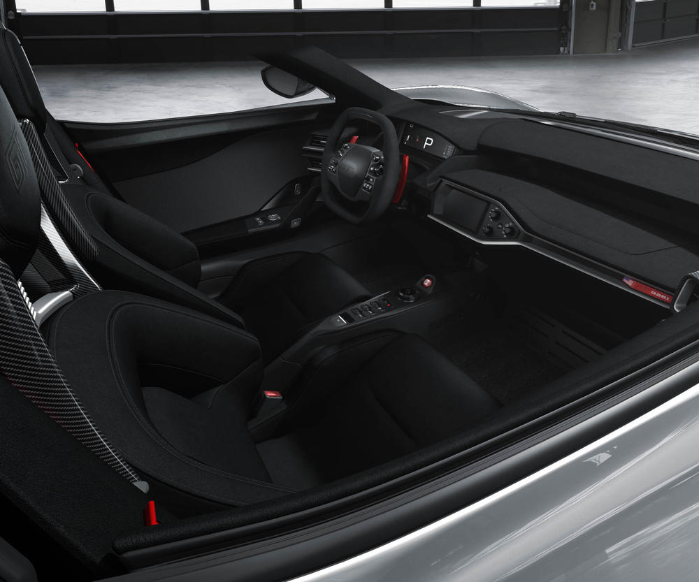 Να σημειωθεί επίσης ότι το κρύσταλλο πίσω από τον οδηγό, είναι κατασκευασμένο από γυαλί Gorilla, διαθέτει το μισό πάχος σε σχέση με αυτό του GT, ενώ είναι και κατά το ήμισυ ελαφρύτερο. Παράλληλα, στον βασικό εξοπλισμό έχουν προστεθεί τροχοί από ανθρακόνημα με μπουλόνια τιτανίου και εξάτμιση 100% από τιτάνιο. Για την περαιτέρω μείωση του βάρους, απουσιάζουν «πολυτέλειες» όπως το σύστημα κλιματισμού, τα ηχεία με το ηχοσύστημα, τα ντουλαπάκια και οι ποτηροθήκες! Από την άλλη, τα καθίσματα «φοράνε» δέρμα Alcantara Suede, ενώ το ανθρακόνημα κάνει έντονη την παρουσία του τόσο στην κεντρική κονσόλα, όσο και στις πόρτες. Το GT Competition Series αποδίδει 647 ίππους (όπως και το κανονικό GT), είναι διαθέσιμο σε 6 χρώματα, ενώ φέρει κλωβό ασφαλείας με την έγκριση της FIA.
