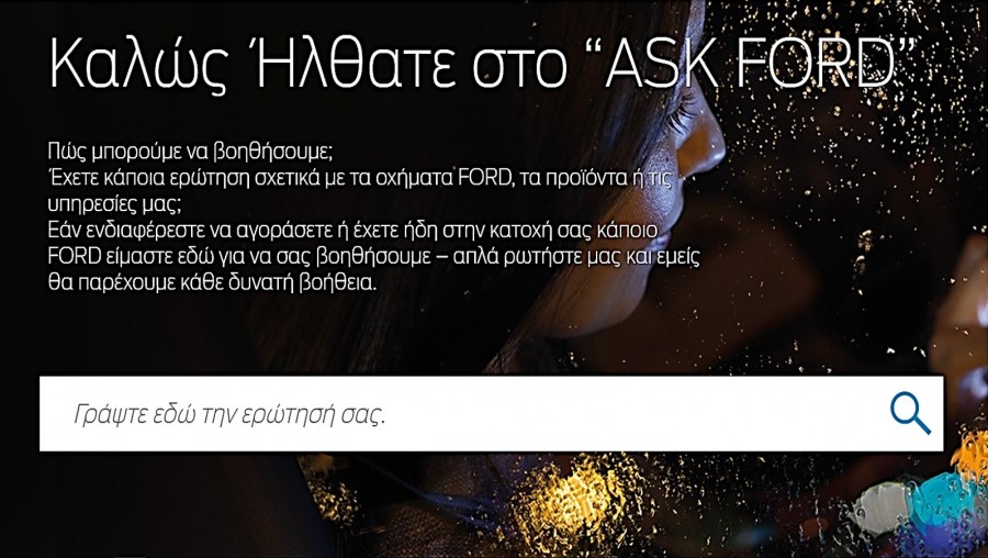 Το έξυπνο αυτό σύστημα είναι μάλιστα ικανό να σας καθοδηγεί σε ιστοσελίδες ή πληροφορίες εμπόρων για να βρείτε την κατάλληλη απάντηση. Στόχος του «Ask Ford» είναι η βελτίωση της εξυπηρέτησης των καταναλωτών και της σχέσης τους με την Ford και για τον λόγο αυτό, όλοι μπορούν να έχουν πρόσβαση στην υπηρεσία μέσω της κεντρικής ιστοσελίδας www.ford.gr και πιο συγκεκριμένα μέσα από το εικονίδιο «Ask Ford», το οποίο εμφανίζεται στα δεξιά της σελίδας αυτής.