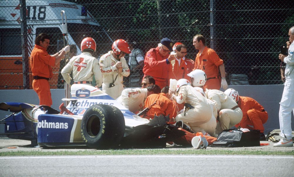 Έπειτα από ατύχημα στην εκκίνηση, το αυτοκίνητο ασφαλείας έκανε την εμφάνισή του αλλά η επανεκκίνηση ήταν προσωρινή. Ο Senna δεν έστριψε ποτέ στη γρήγορη αριστερή στροφή Ταμπουρέλο και η Williams χτύπησε τον τοίχο με σχεδόν 250 χιλιόμετρα/ώρα. Τρία διαφορετικά εξαρτήματα του μονοθέσιου χτύπησαν το κεφάλι του, με τα δύο από αυτά να διαπερνούν το κράνος.