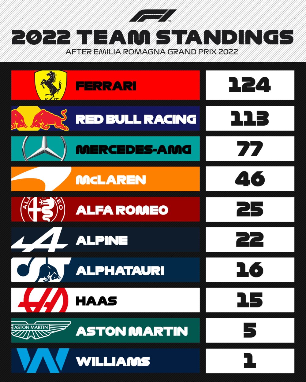 Στη βαθμολογία των οδηγών, ο Leclerc παραμένει στην κορυφή αλλά πλέον ο Verstappen είναι αυτός που τον καταδιώκει, με 27 πόντους να τους χωρίζουν. Από κοντά κι ο Perez ενώ έκτος ανέβηκε ο Norris.