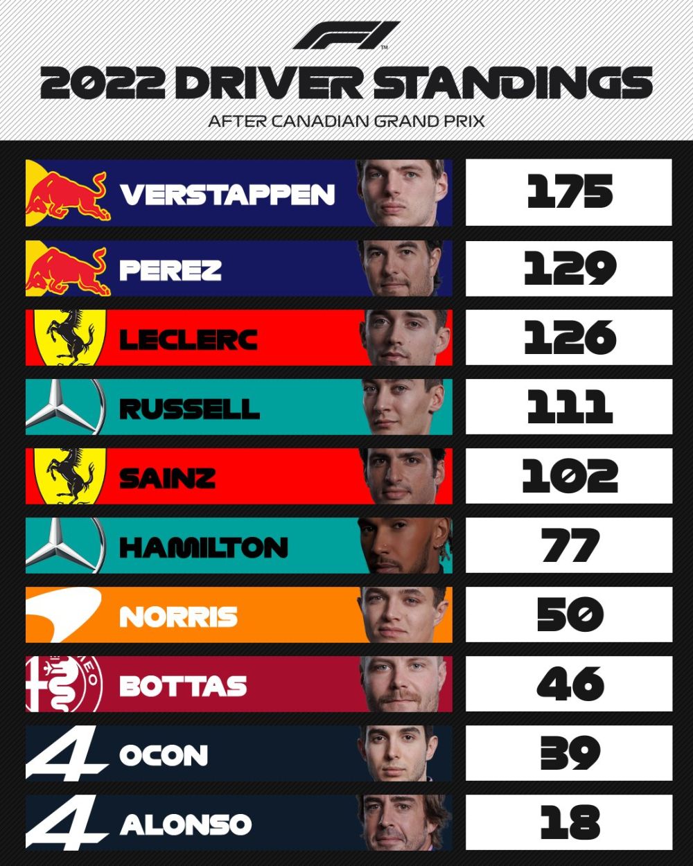 Να πως διαμορφώνεται η βαθμολογία των οδηγών, με τον Verstappen να έχει πλέον ξεφύγει και τον Leclerc να παραμένει τρίτος στην κατάταξη.