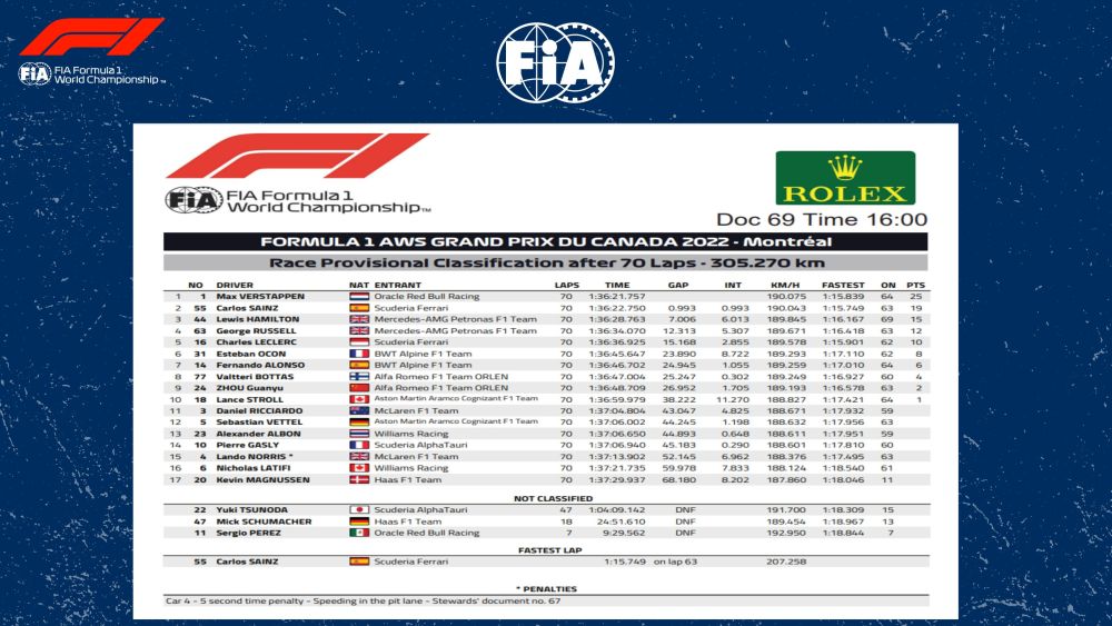 Ένα ακόμα βήμα στην προσπάθεια υπεράσπισης του θρόνου του έκανε στον Καναδά ο Max Verstappen. Ο Ολλανδός εκμεταλλεύτηκε στο έπακρο το πλεονέκτημα που είχε αφ` ενός λόγω της pole position κι αφετέρου λόγω της χαμηλής θέσης του Charles Leclerc στο grid, φτάνοντας στην πρώτη νίκη της καριέρας του στο σιρκουί Gilles Villeneuve.