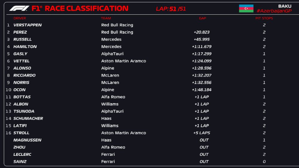 Το Grand Prix του Αζερμπαϊτζάν αποτέλεσε έναν ακόμα αγώνα ανατροπών, έναν ακόμα αγώνα που στην πορεία άλλαξαν οι ισορροπίες ανάμεσα στη Red Bull Racing και τη Scuderia Ferrari. Στο τέλος πανηγύρισε η Αυστριακή ομάδα, έκανε το 1-2 που την εδραίωσε στις βαθμολογικές κορυφές, έχοντας διανύσει 8 από τις 22 στάσεις του φετινού Παγκοσμίου Πρωταθλήματος της Formula 1!