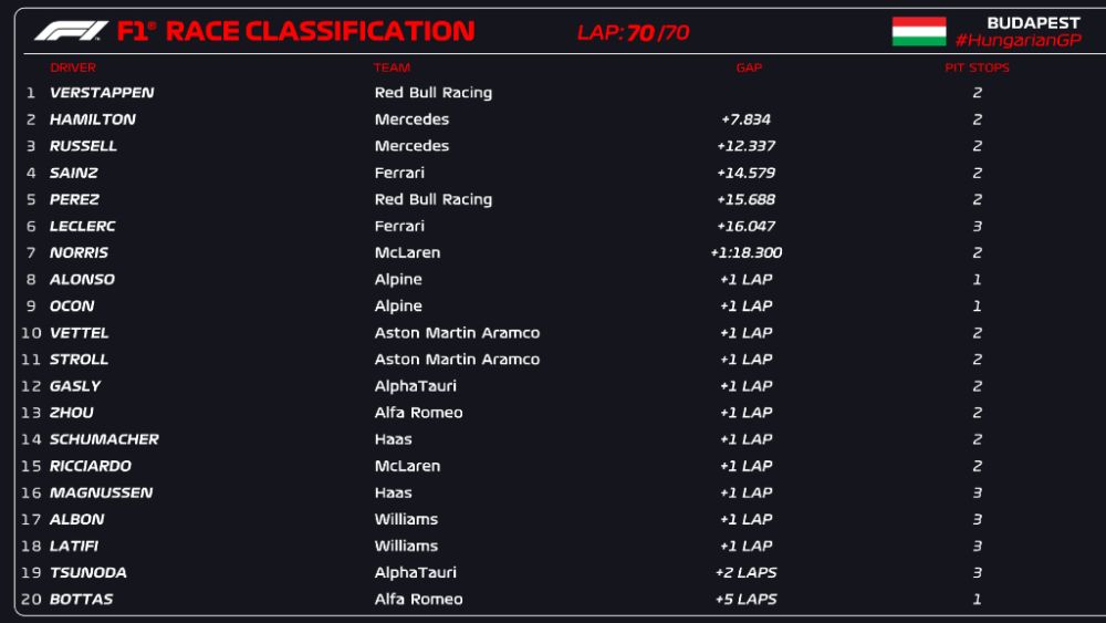 Εκκινώντας από τη δέκατη θέση του grid, ο Max Verstappen περιόριζε τους στόχους του σε μία θέση στο βάθρο. Κι αυτό ήταν το καλό σενάριο. Να όμως που ο οδηγός της Red Bull Racing ανέβηκε στο ψηλότερο σκαλί, για όγδοη φορά φέτος. Αποτέλεσμα που του επιτρέπει να πάει διακοπές με βαθμολογικό προβάδισμα 80 πόντων! Με αρωγό φυσικά τη Ferrari.